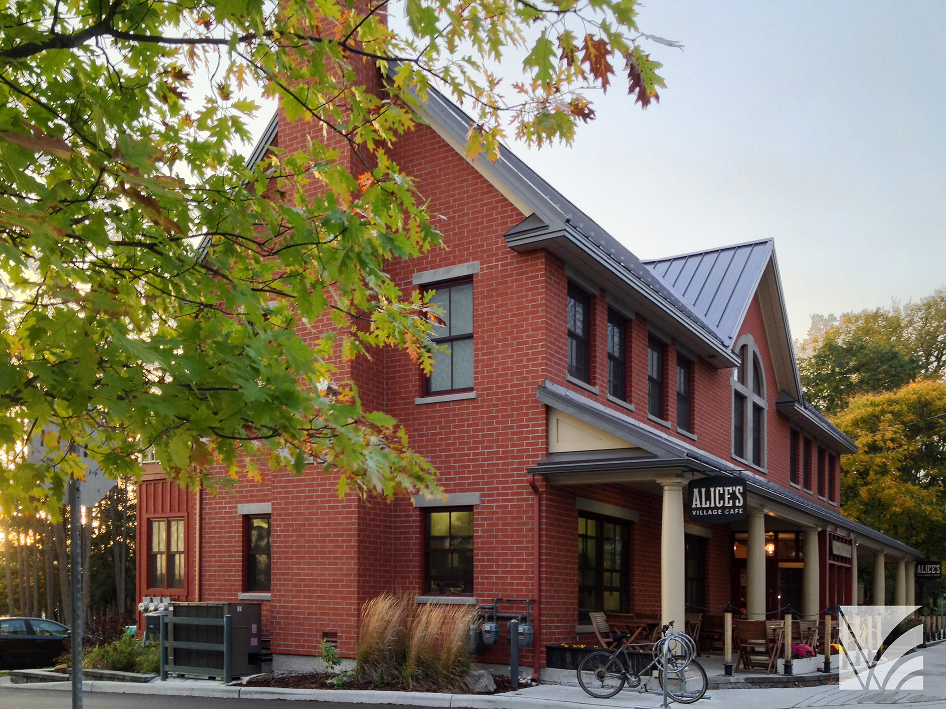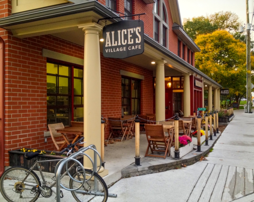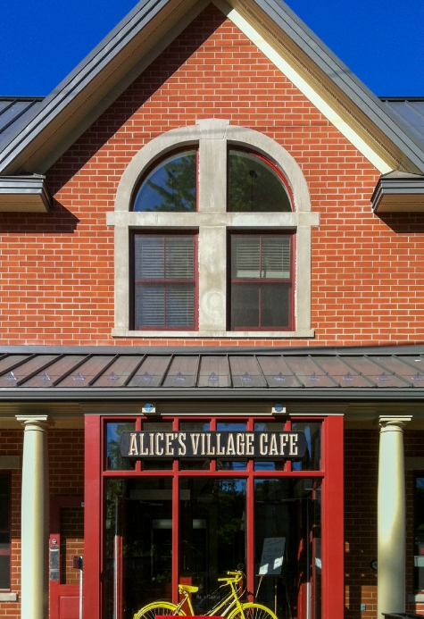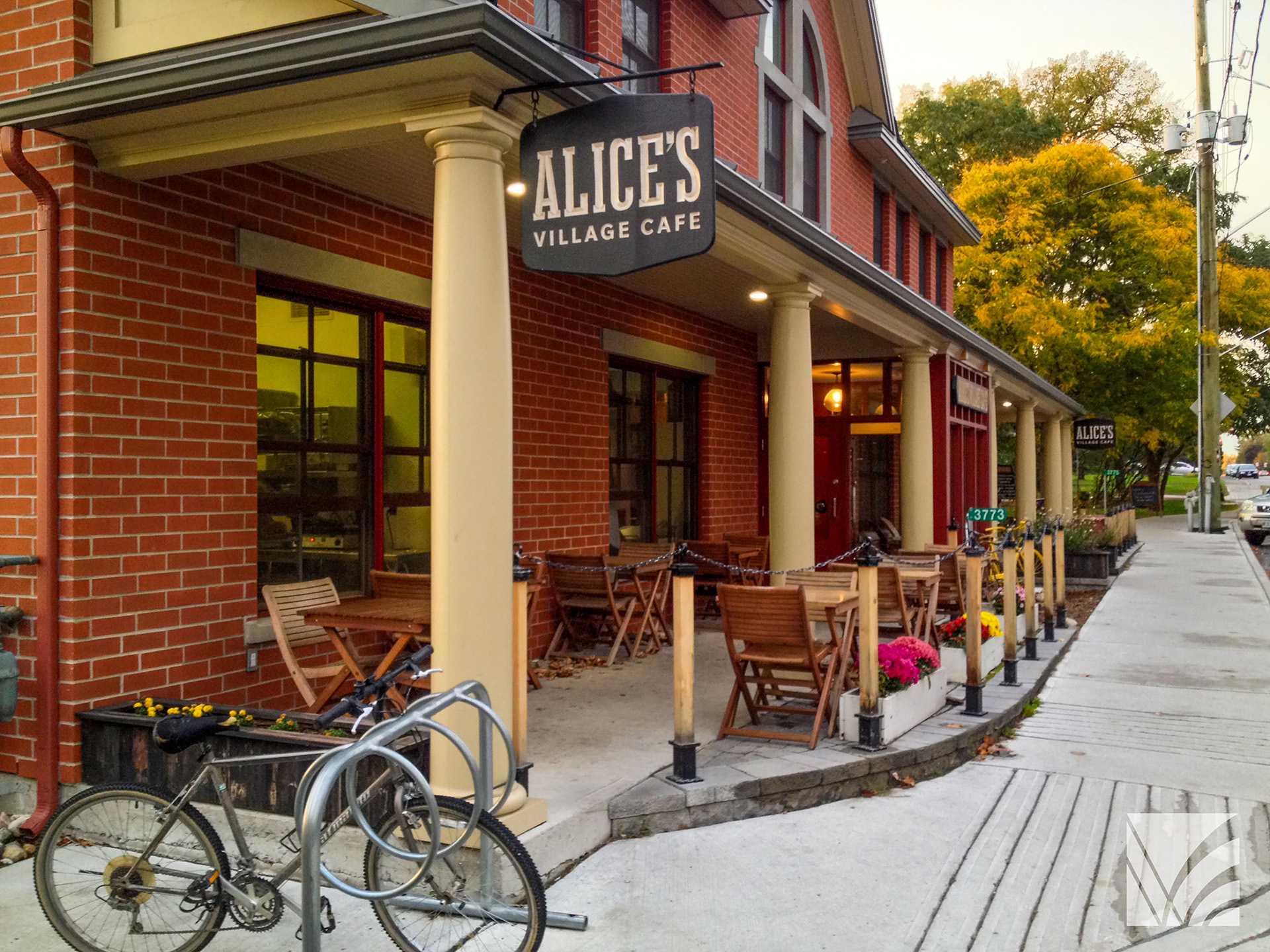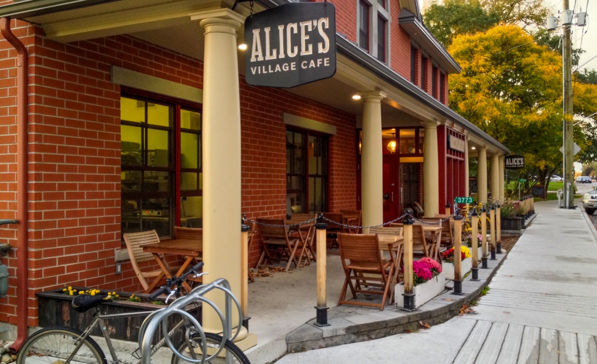This narrative rings true to many who live in, or near the historic village of Carp. The staff at Alice’s Café are frequently asked with quizzical looks, “Um, what was this place before?” Although new and completed in the early fall of 2012, its presence in the historic village seems timeless. The site was once the Anglican priest’s garden. The Rector’s home, a large, two-storey red brick Edwardian, has stood stalwart to the north of the site since 1905. Directly across the road, the neo-gothic St. James Anglican Church, dates to 1889. Kitty-corner to the northeast, proudly punctuating the skyline, is the landmark octagonal Carp Fair barn, in its iconic red. The new mixed use red brick building is home to Alice’s village café, and two bright residential apartments on the second floor. The Café has become a regular gathering place for the village from sunrise to sunset and a destination for folks from all over Ottawa to visit by car, motorcycle, bike, or snowmobile. Live music and songs from an open mic fill a summer night.