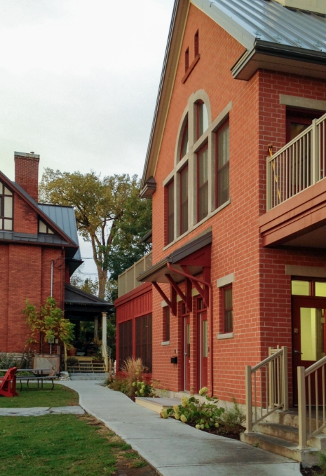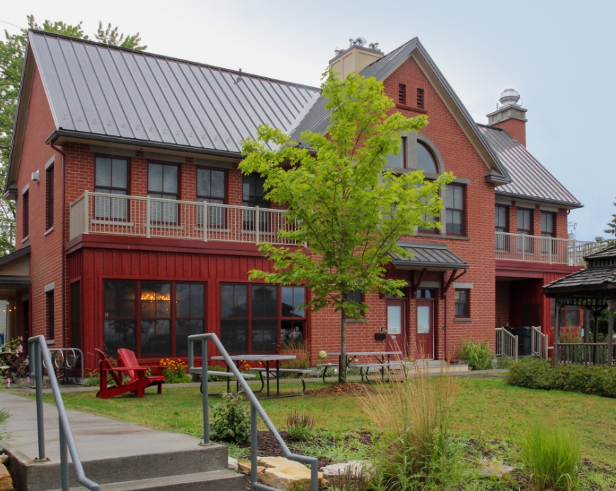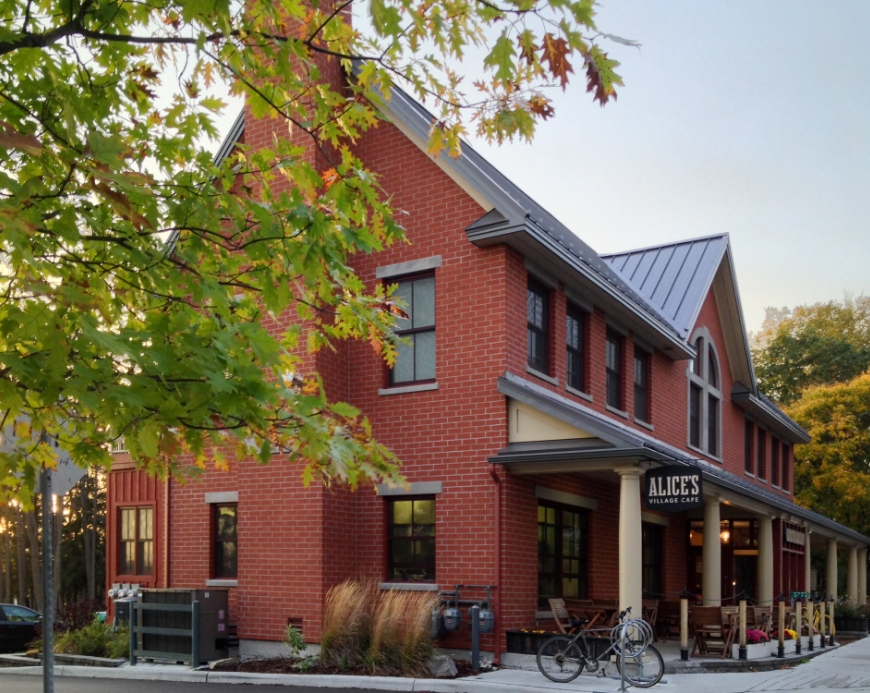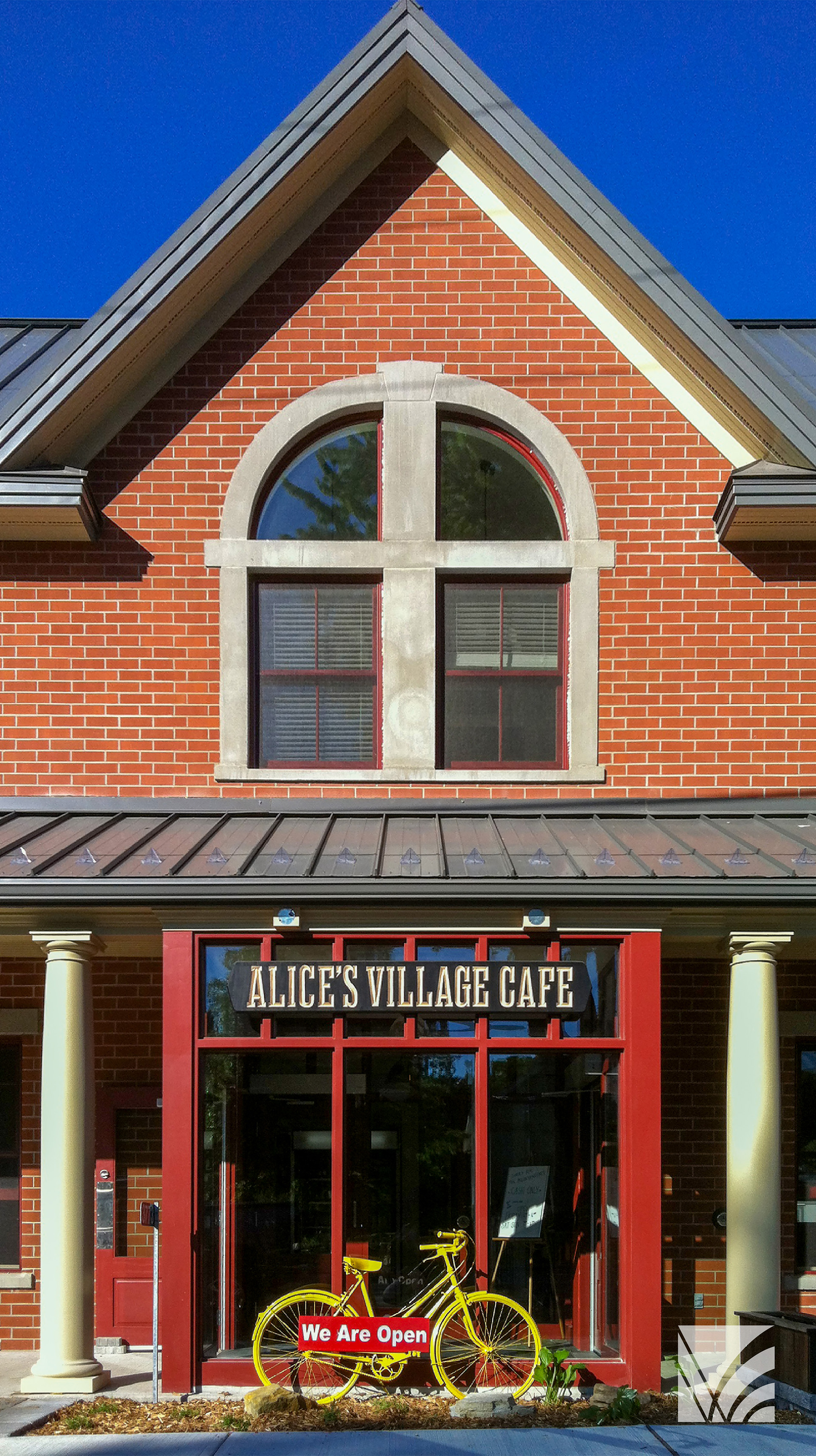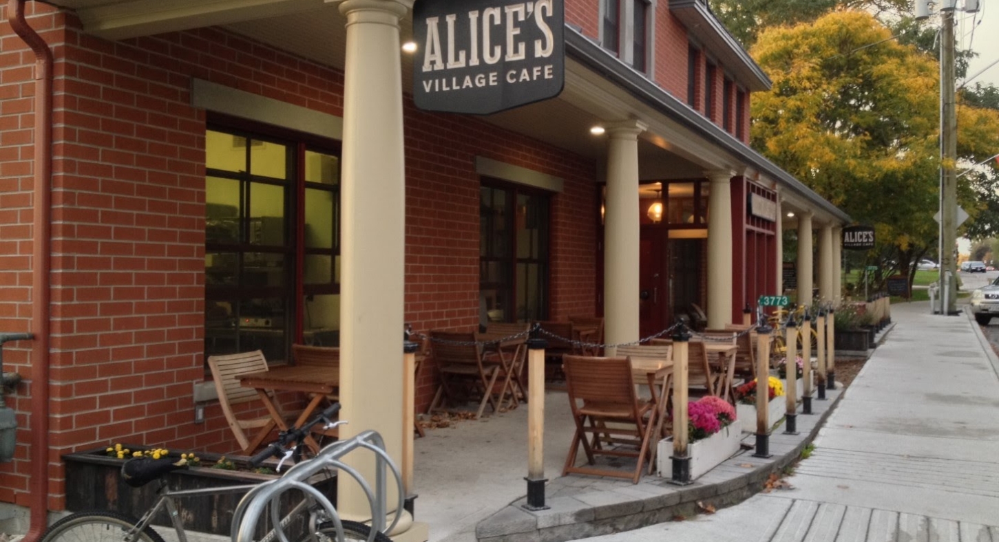 This narrative rings true to many who live in, or near the historic village of Carp. The staff at Alice’s Café are frequently asked with quizzical looks, “Um, what was this place before?” Although new and completed in the early fall of 2012, its presence in the historic village seems timeless. The site was once the Anglican priest’s garden. The Rector’s home, a large, two-storey red brick Edwardian, has stood stalwart to the north of the site since 1905. Directly across the road, the neo-gothic St. James Anglican Church, dates to 1889. Kitty-corner to the northeast, proudly punctuating the skyline, is the landmark octagonal Carp Fair barn, in its iconic red. The new mixed use red brick building is home to Alice’s village café, and two bright residential apartments on the second floor. The Café has become a regular gathering place for the village from sunrise to sunset and a destination for folks from all over Ottawa to visit by car, motorcycle, bike, or snowmobile. Live music and songs from an open mic fill a summer night.