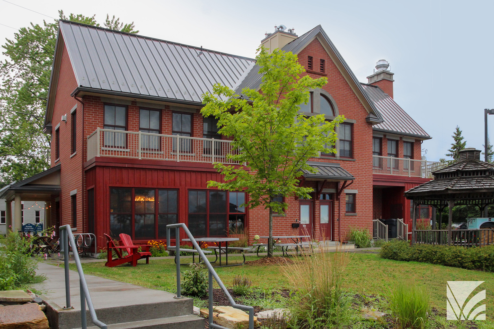 The human scale of the new cafe makes it approachable and inviting. The generous porches and large windows facing Main Street engage people walking by. Inside and out, the café’s gathering spaces have become an integral part of village life. It is a a buzzing center of conversation, a meeting place, a place to read and catch up on the local news, and a place for local talent to perform. This work of urban design has successfully re-animated a once quiet village main street.