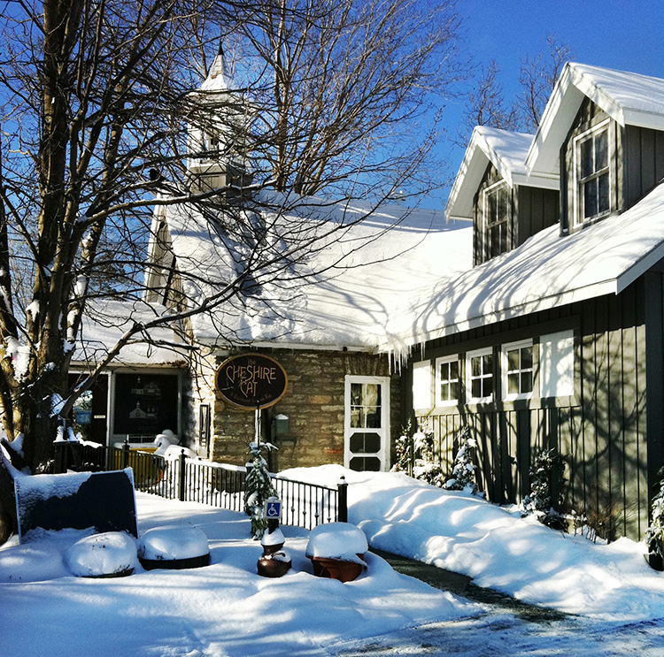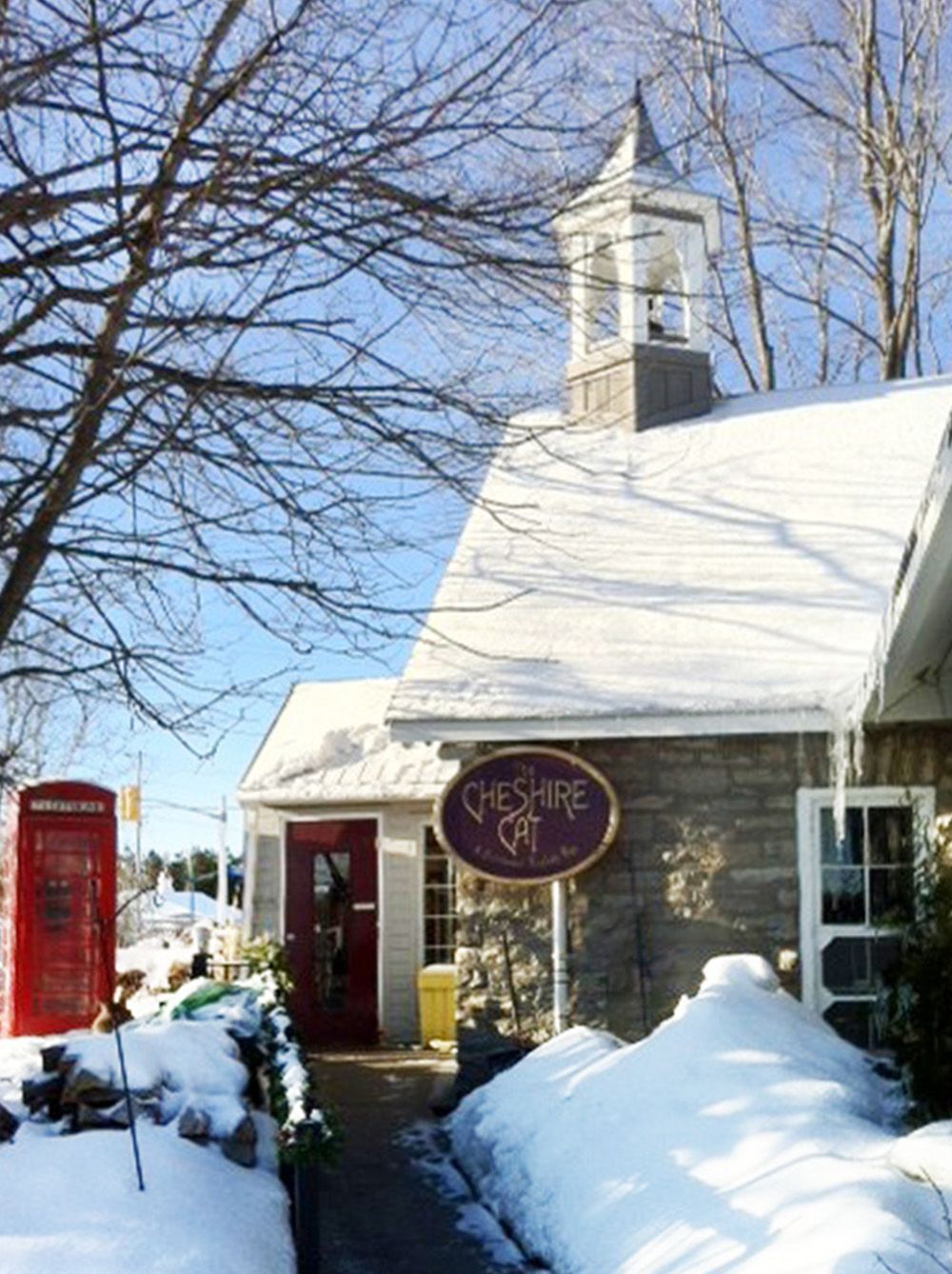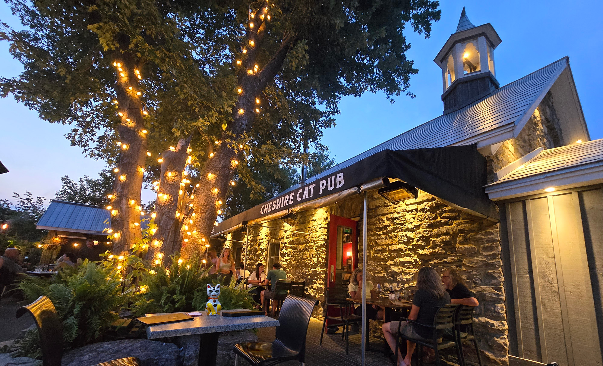 The Cheshire Cat Pub has become a local institution in western Ottawa, widely recognized for its traditional yet inventive pub-fare and cozy pub environment. “The Cat” as it’s locally known, was built in the shell of an old stone country school-house that was burnt out. From the outside, much of the heritage school-house was restored as closely as possible to its original state with wood-sashed windows and a gleaming tin roof. Inside, the authentic pub atmosphere comes from a balance of simplicity in design, and an attention to detail in execution. Low timbered ceilings create an instant sense of intimacy around the bar and woodstove. The stone walls are decorated with an eclectic mix of retired beer tap handles, antique hunting paraphernalia and a faded portrait of the young King Charles II.
