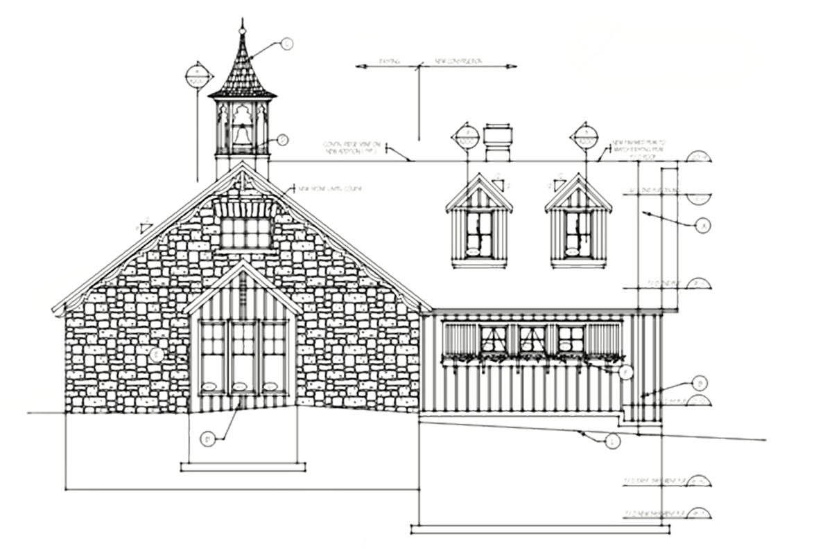 Having burnt out in 2013, the design approach for “The Cat” included protecting the heritage of the building through retaining and restoring as much of the original stone schoolhouse as possible. During the fire, the roof had collapsed, destroying the original bell and cupola. Using historic photos of the building the bell tower has been carefully reinstated, returning the schoolhouse to its former glory. The entrance vestibule was refurbished with new board and batten siding and wood-hung windows, echoing the original design. The stone masonry was repointed, preserving the solid foundation and maintaining its original character. Delicate "gingerbread" details and the original soffit and fascia were restored, bringing back the fine craftsmanship that once adorned the building.