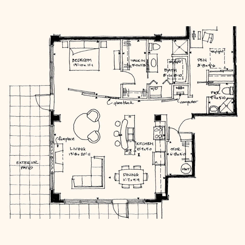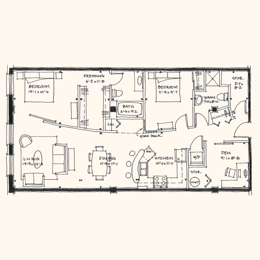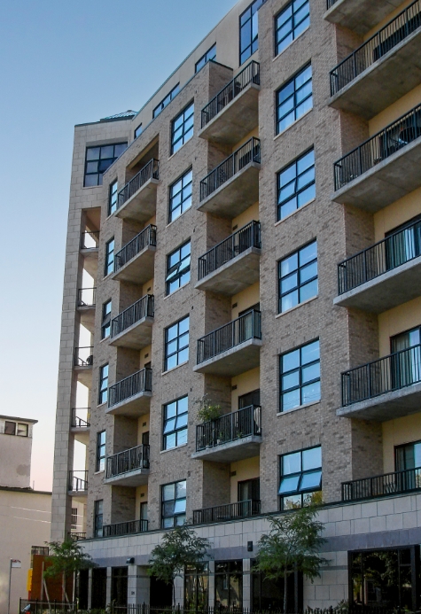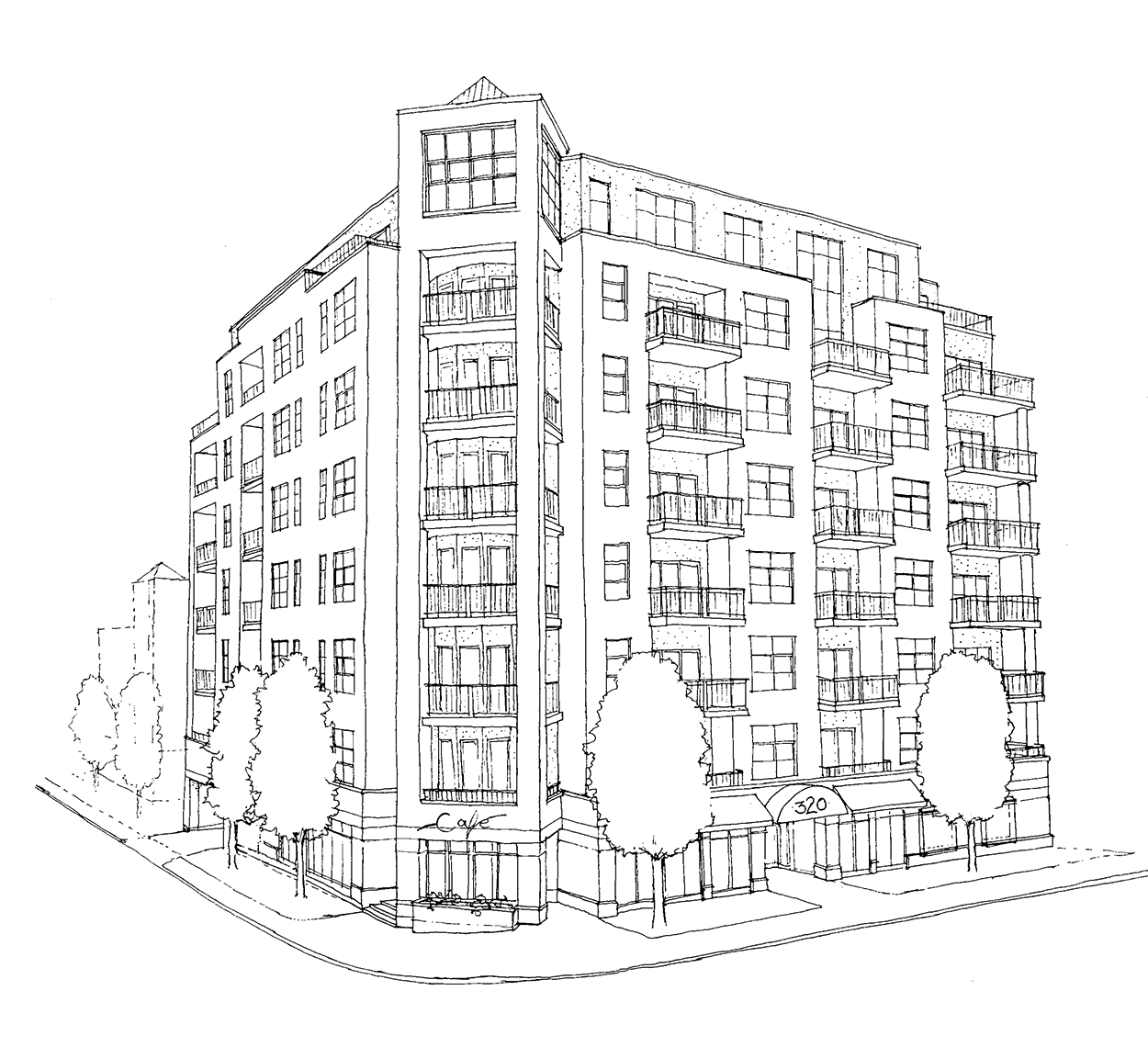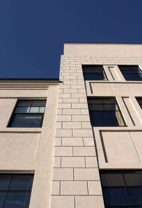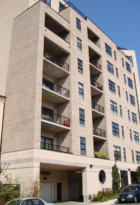 The first phase transformed the existing structure into 16 loft-style condominiums, keeping its footprint, windows, and three-story height intact. A recessed penthouse, glass retail doors, stonework, and industrial-inspired lighting modernized the space, while pedestrian-friendly details and indoor parking enhanced the streetscape. Inside, the industrial character was celebrated with exposed concrete columns, refurbished wood floors, and visible ductwork. Sliding partitions and curved walls added contrast to the raw structure.