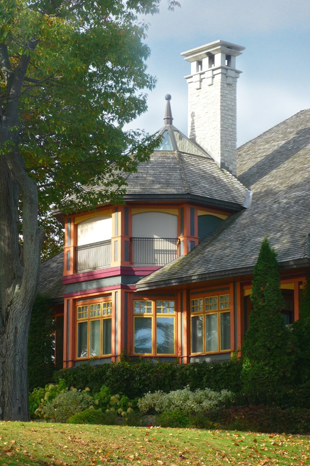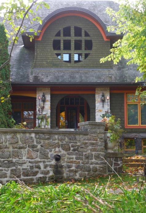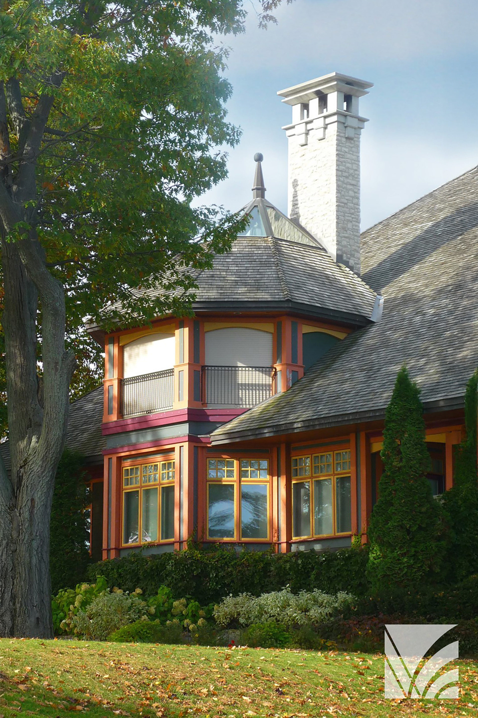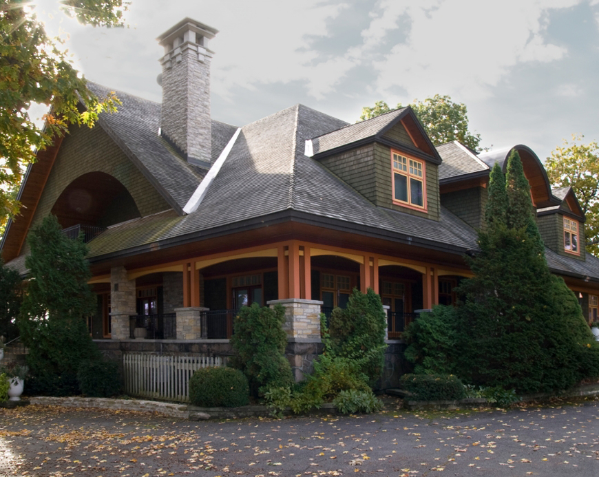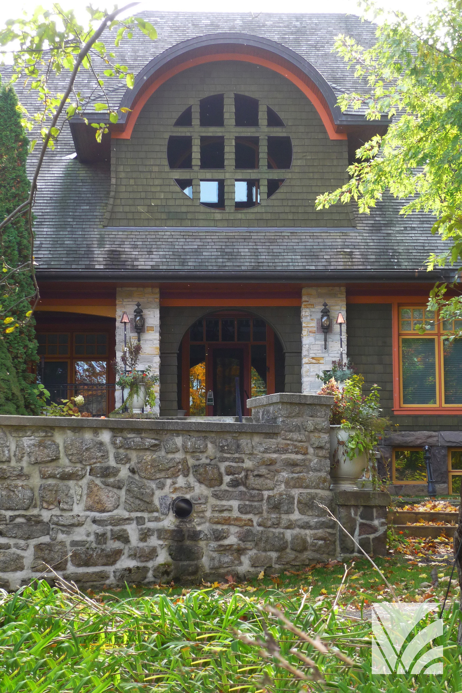 The Thousand Islands House builds on foundations dating from the early 1900’s. Time and a disastrous fire had left this once-dignified family retreat on the banks of the St. Lawrence River, a shadow of its former self. The impressive stone foundations, and ground floor of the lodge were salvaged and integrated into a generous shingle-style cottage, with a large verandah and screened porch, under a sweeping wood-shingled roof. New stone was carefully selected to expand the porch and add steps down to the river, improving the connection of the cottage to the landscape while respecting the original character of the grand house. Many heritage wrought iron features were thoughtfully reused throughout the property. Upon entering the home, a double height foyer with vaulted ceiling and a craftsman portal window seamlessly tie the well-preserved ground floor to the new second storey. The addition of the second storey allowed the house to be fully updated with modern amenities such as a laundry room in the new living space, while respecting the heritage character of the ground floor.