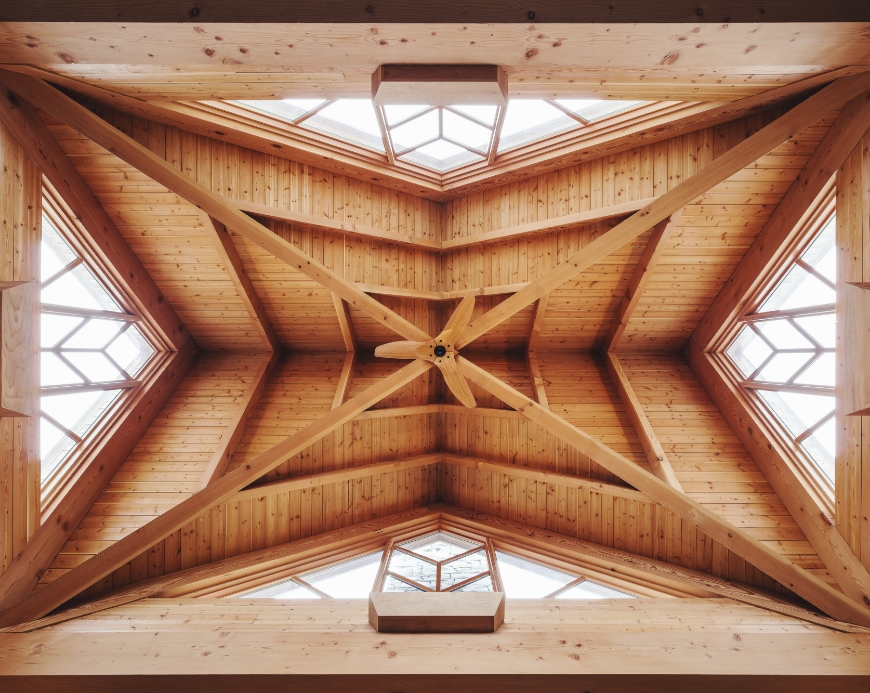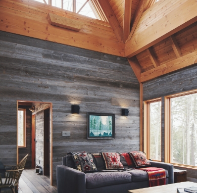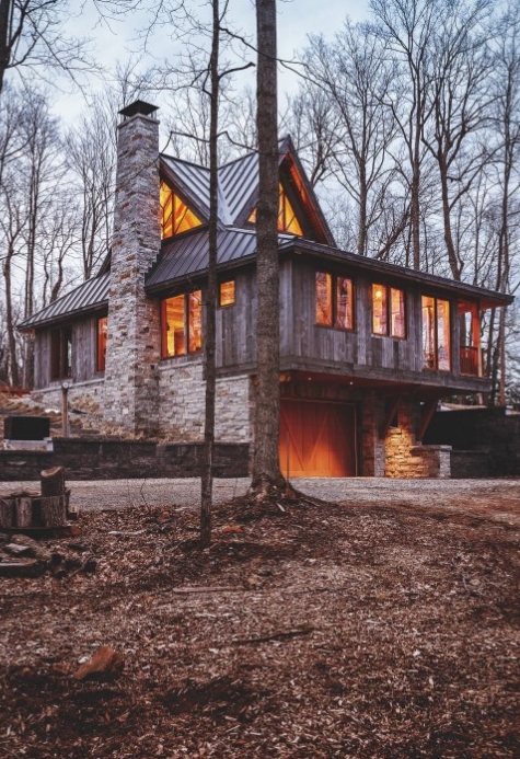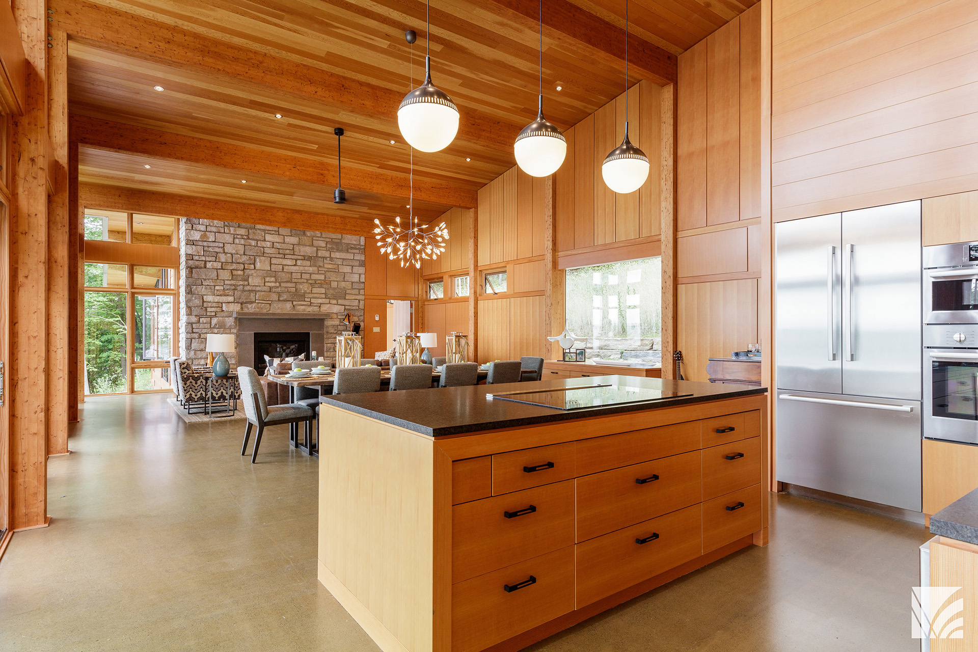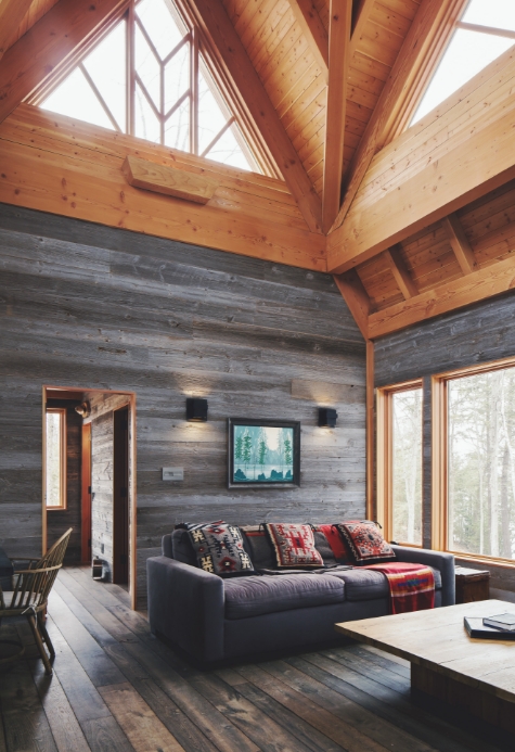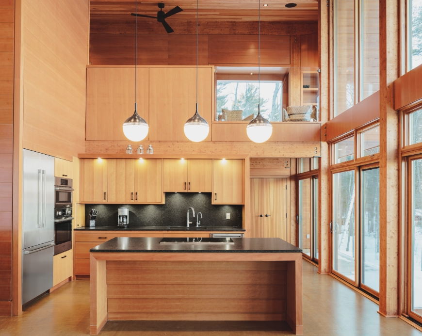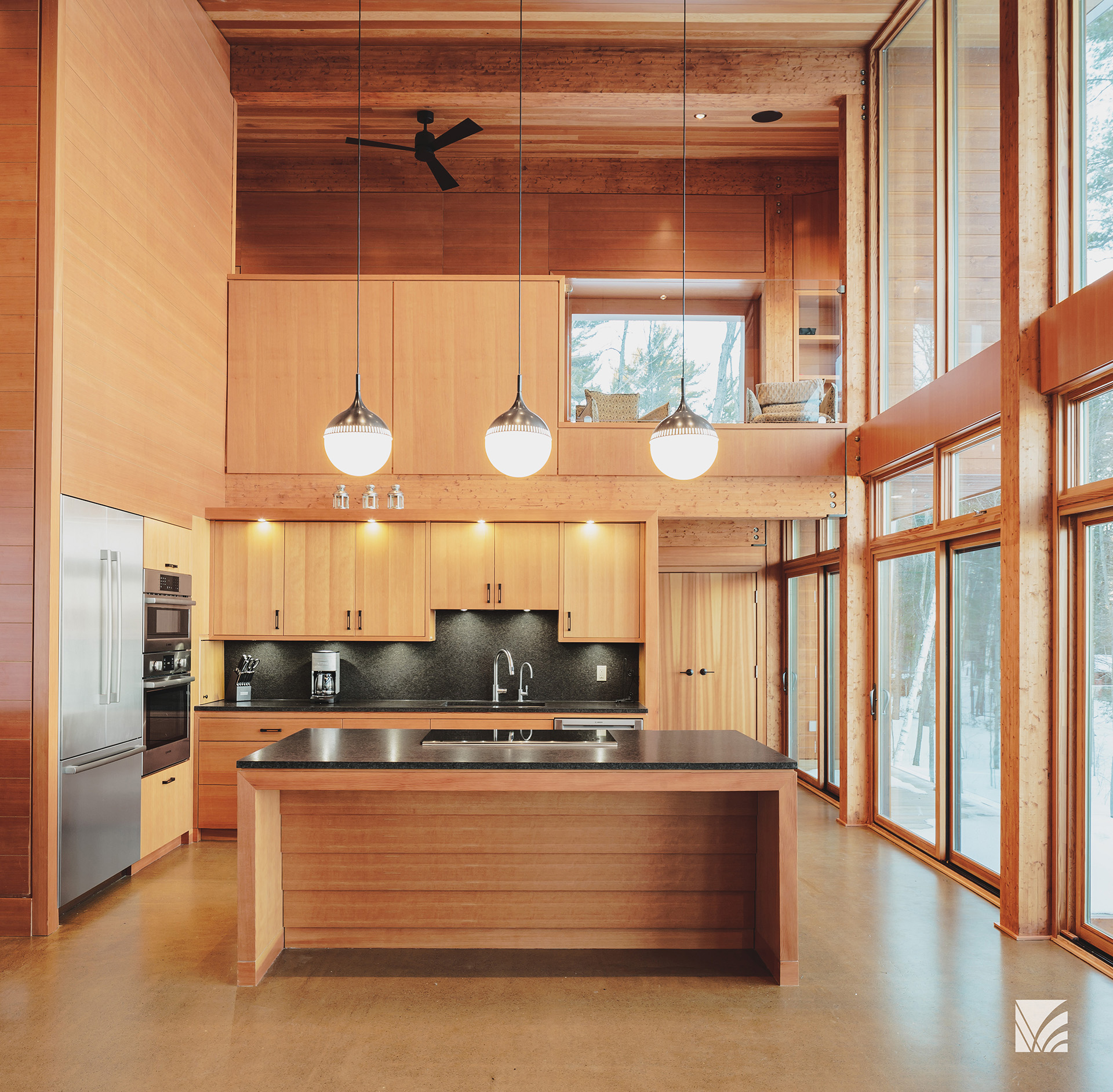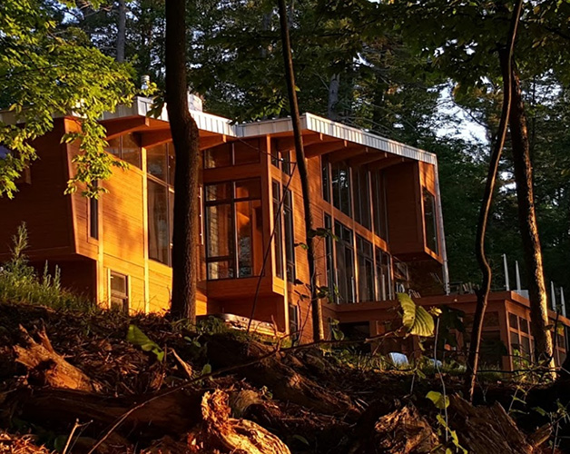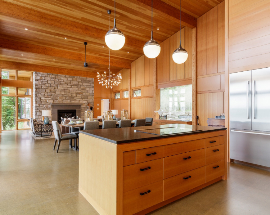 Morning rays penetrate past tree trunks into the east-side porch, master bedroom, and kitchen. As the sun rises, more light cascades through the clerestory’s kaleidoscope of timber and glass. At day’s end, the sun sets beyond the lake’s western shore, giving way to the hearth's outpour of firelight.