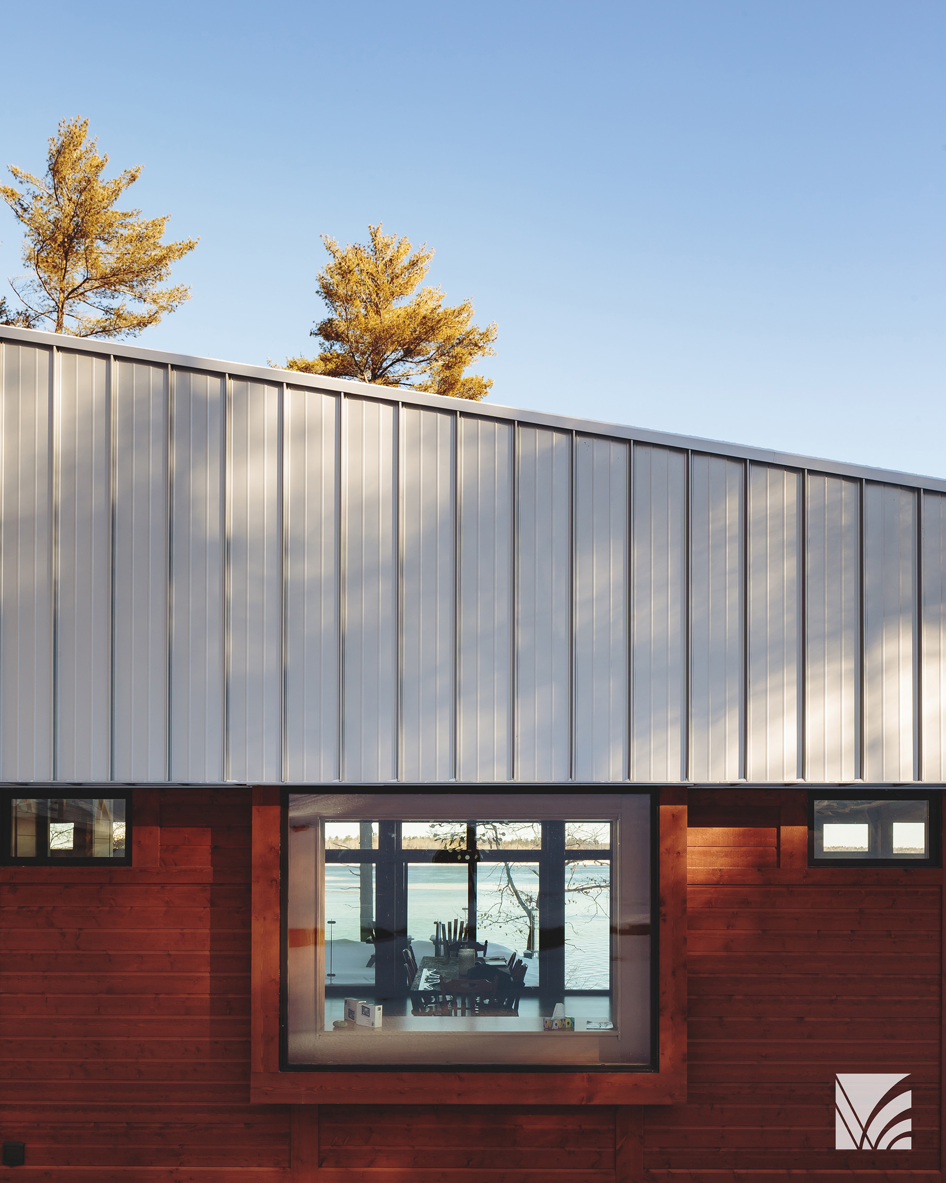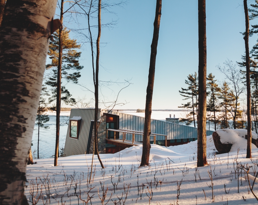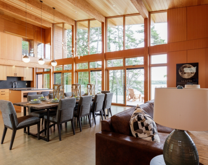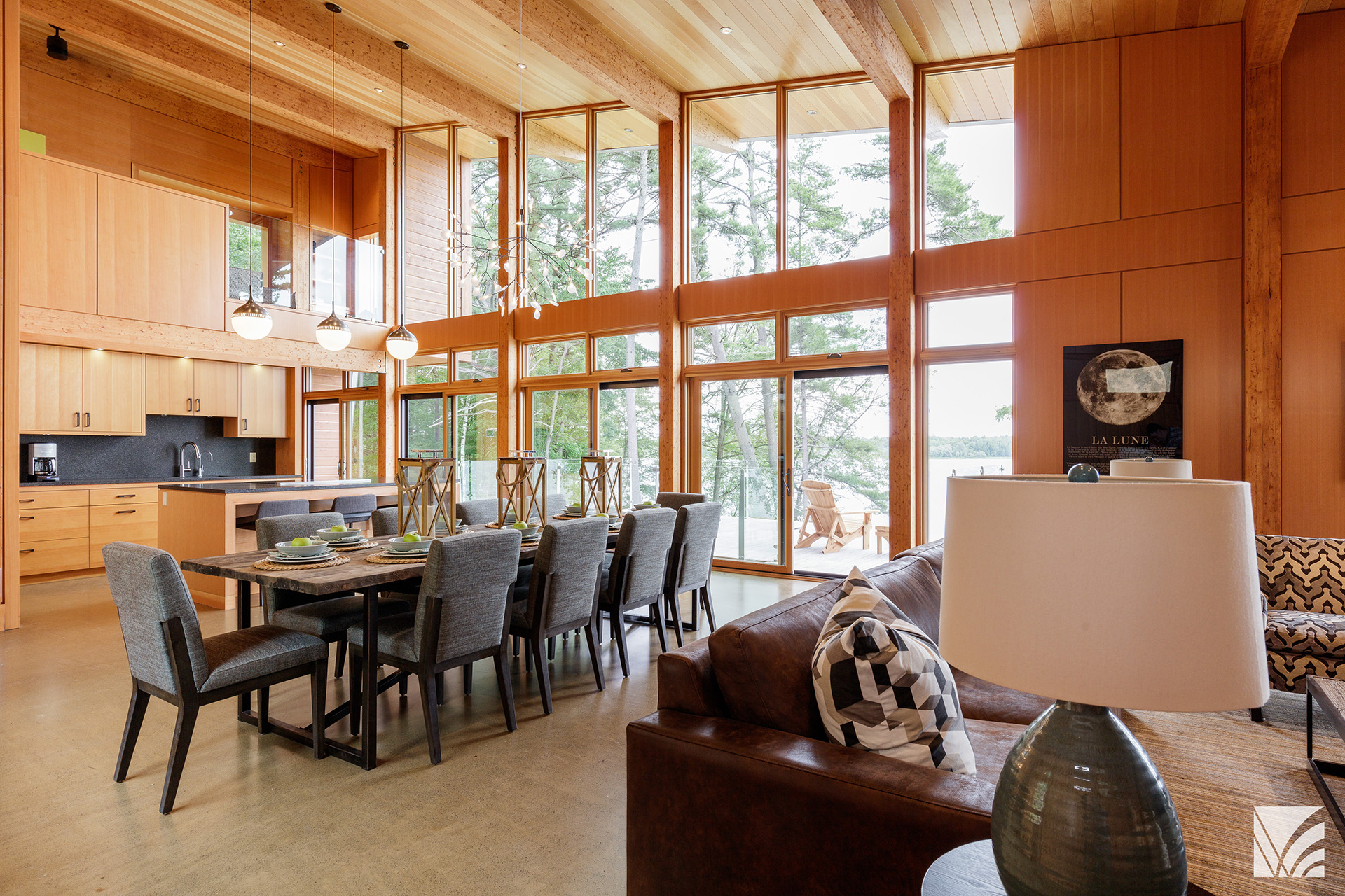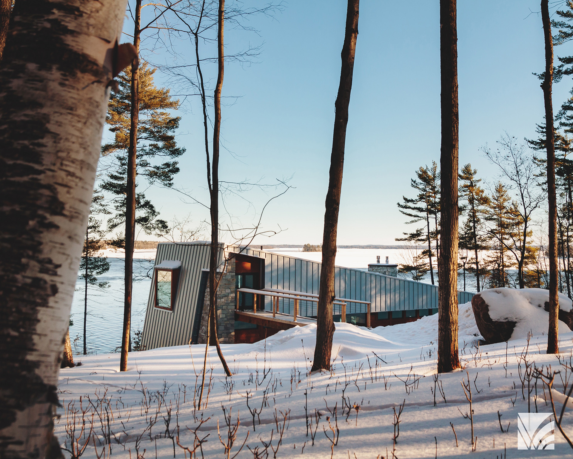 Completed in the summer of 2015, this 4000-square-foot vacation home rests on a picturesque Canadian island on the Kitchissippi - the mighty Ottawa River. The winding laneway to the home is bordered by century-old pine trees. Visitors are met with a breathtaking shoreline that was once the winter campsite of French explorer Samuel de Champlain over 400 years ago. From this island, flanked by roaring rapids, Algonquin Chief Tessouat controlled access to the northern trade routes.