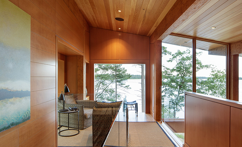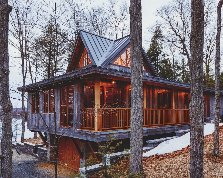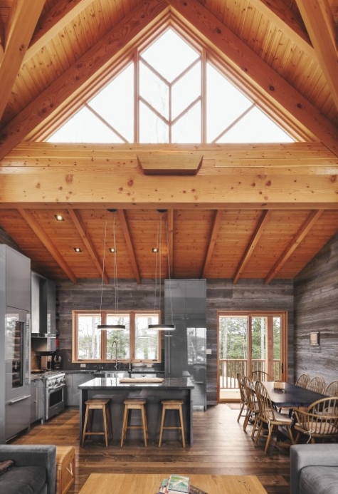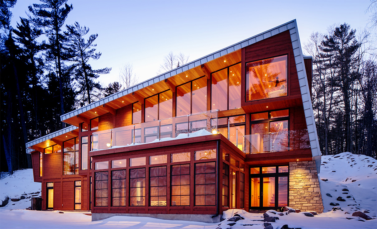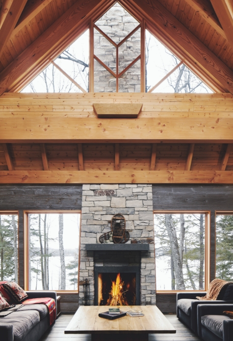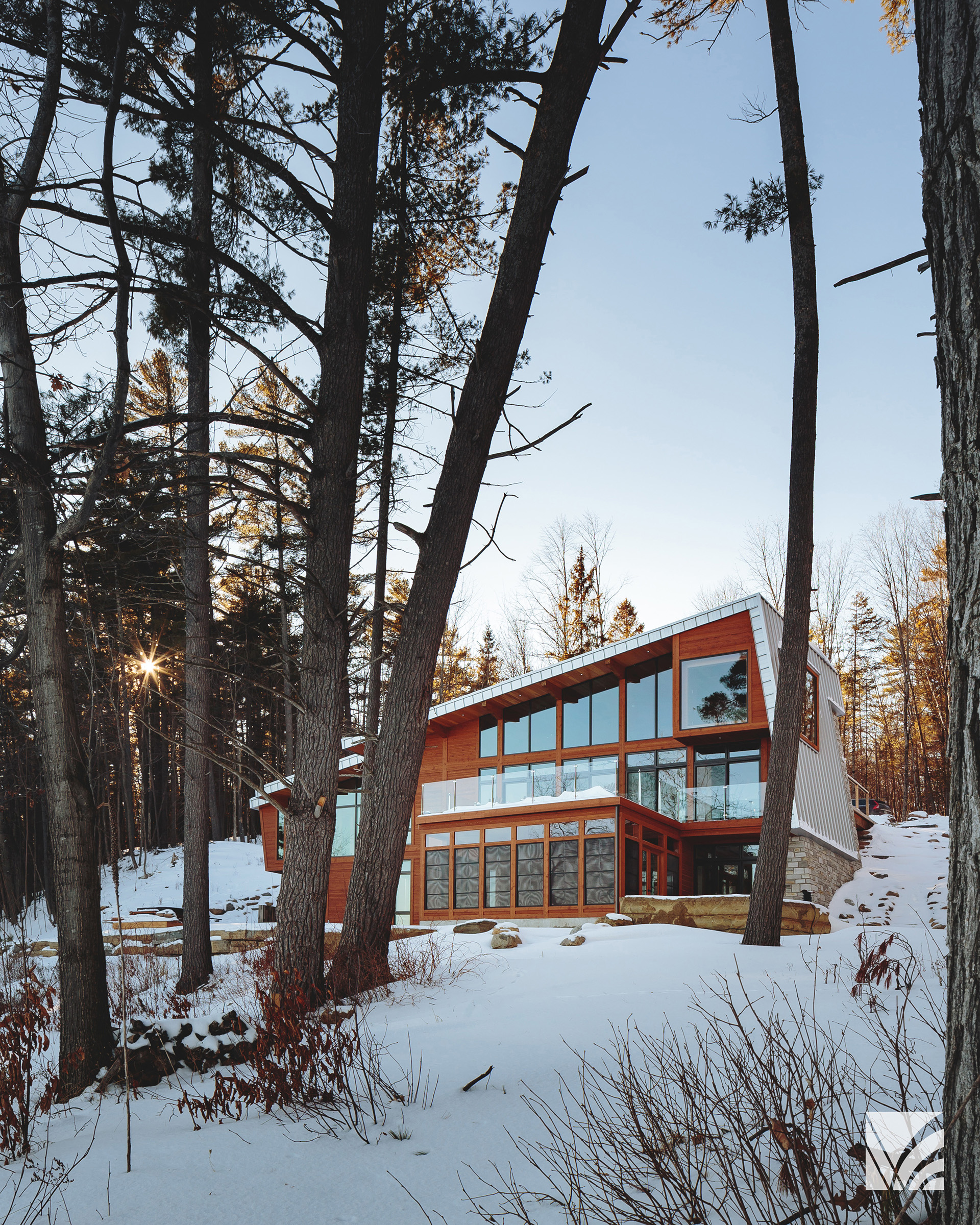 Completed in the summer of 2015, this 4000-square-foot vacation home rests on a picturesque Canadian island on the Kitchissippi - the mighty Ottawa River. The winding laneway to the home is bordered by century-old pine trees. Visitors are met with a breathtaking shoreline that was once the winter campsite of French explorer Samuel de Champlain over 400 years ago. From this island, flanked by roaring rapids, Algonquin Chief Tessouat controlled access to the northern trade routes.