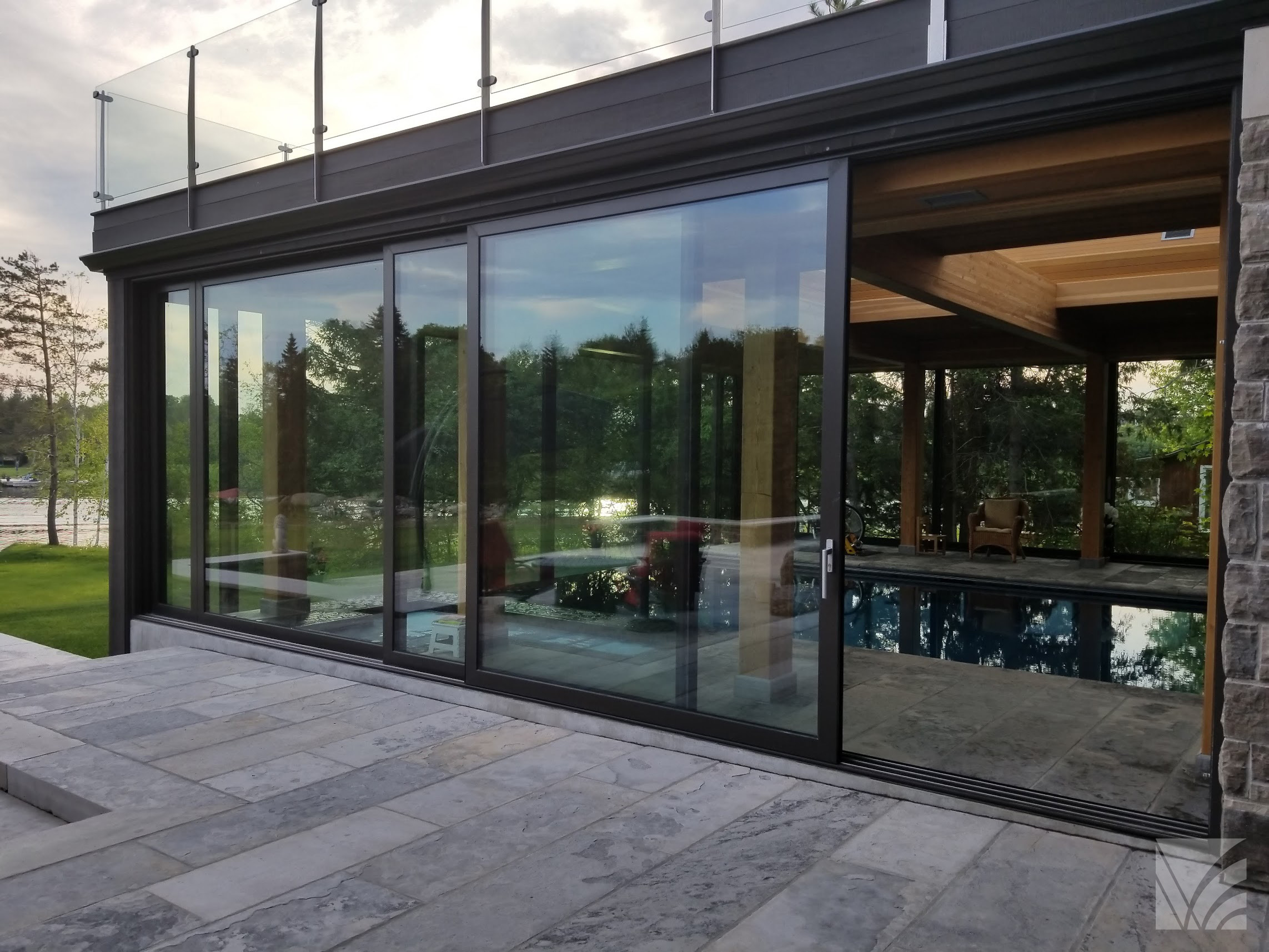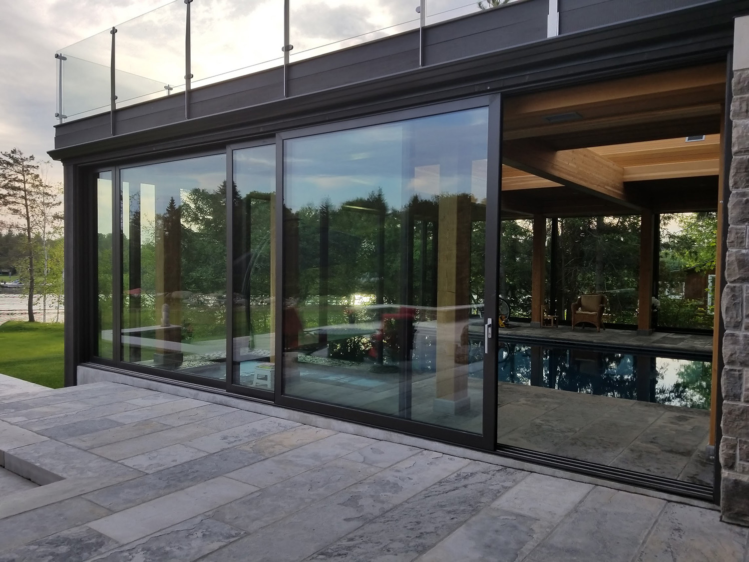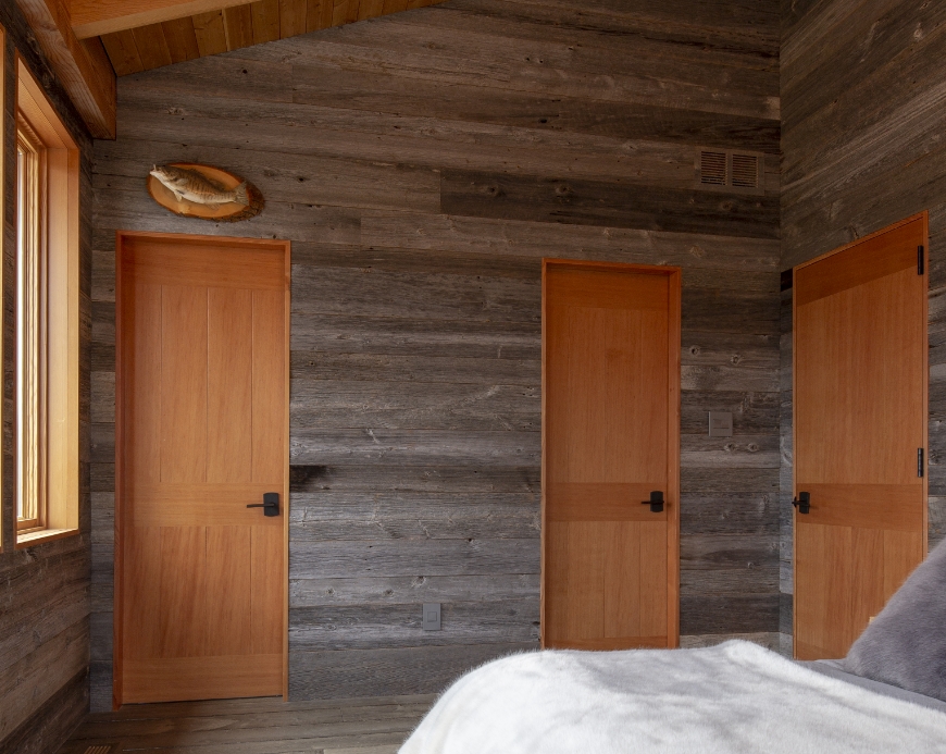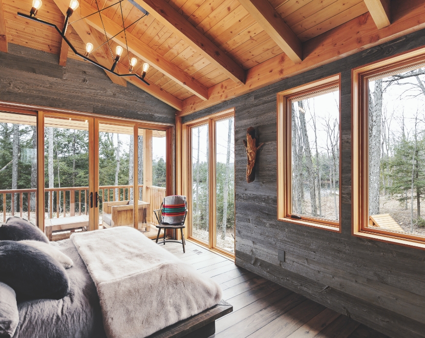The sliding patio doors and windows are crafted and clad in copper-coloured aluminum. The colour and cladding of the windows creates a harmonious finish, resonating with the blanket of copper leaves surrounding Arrowwood Cottage.