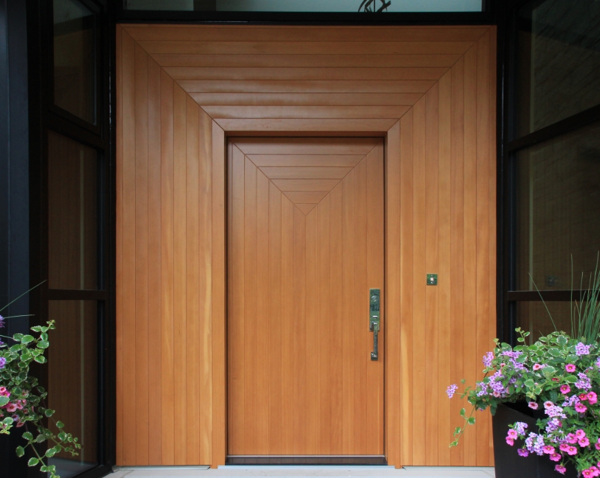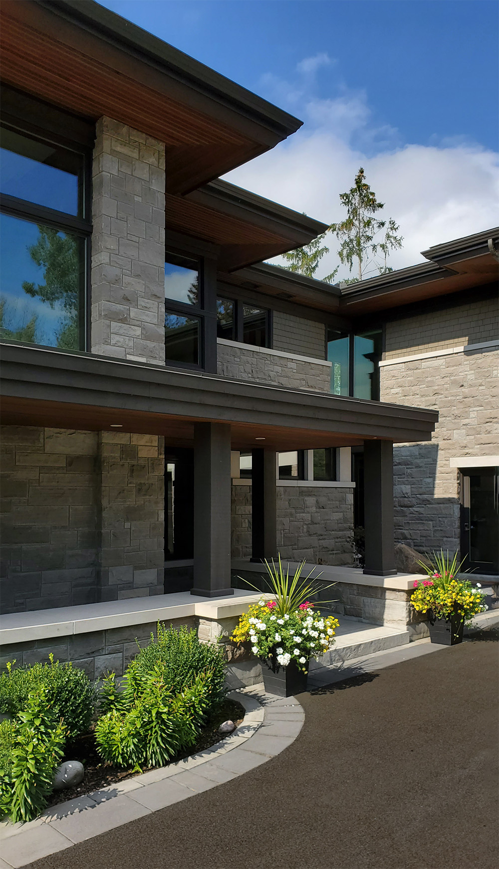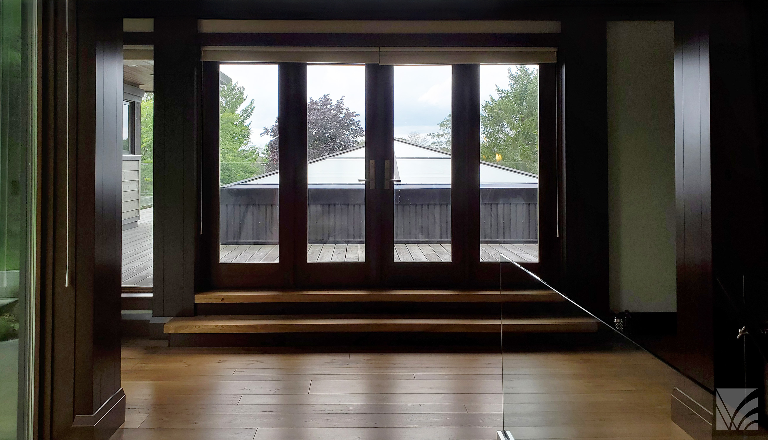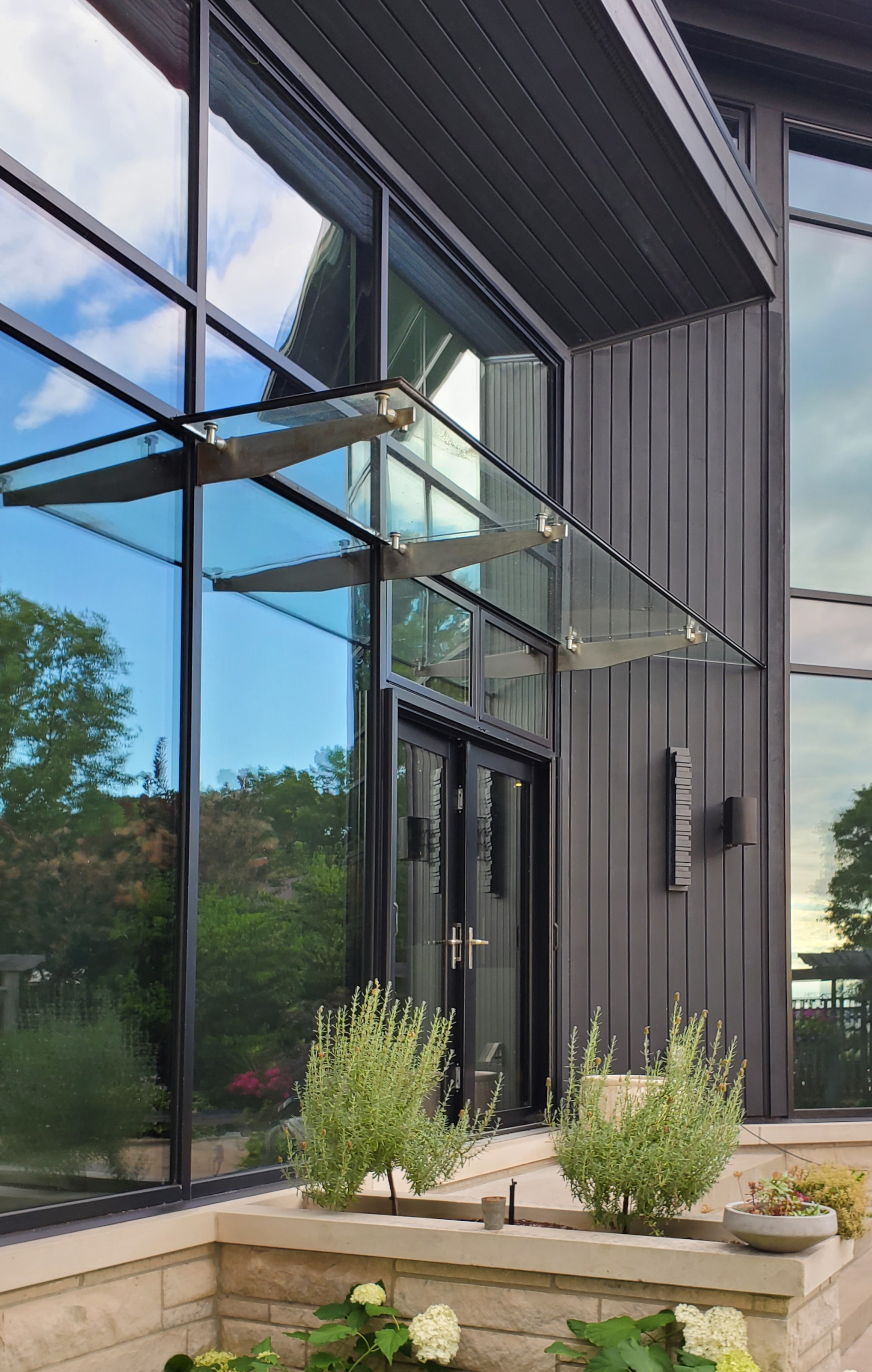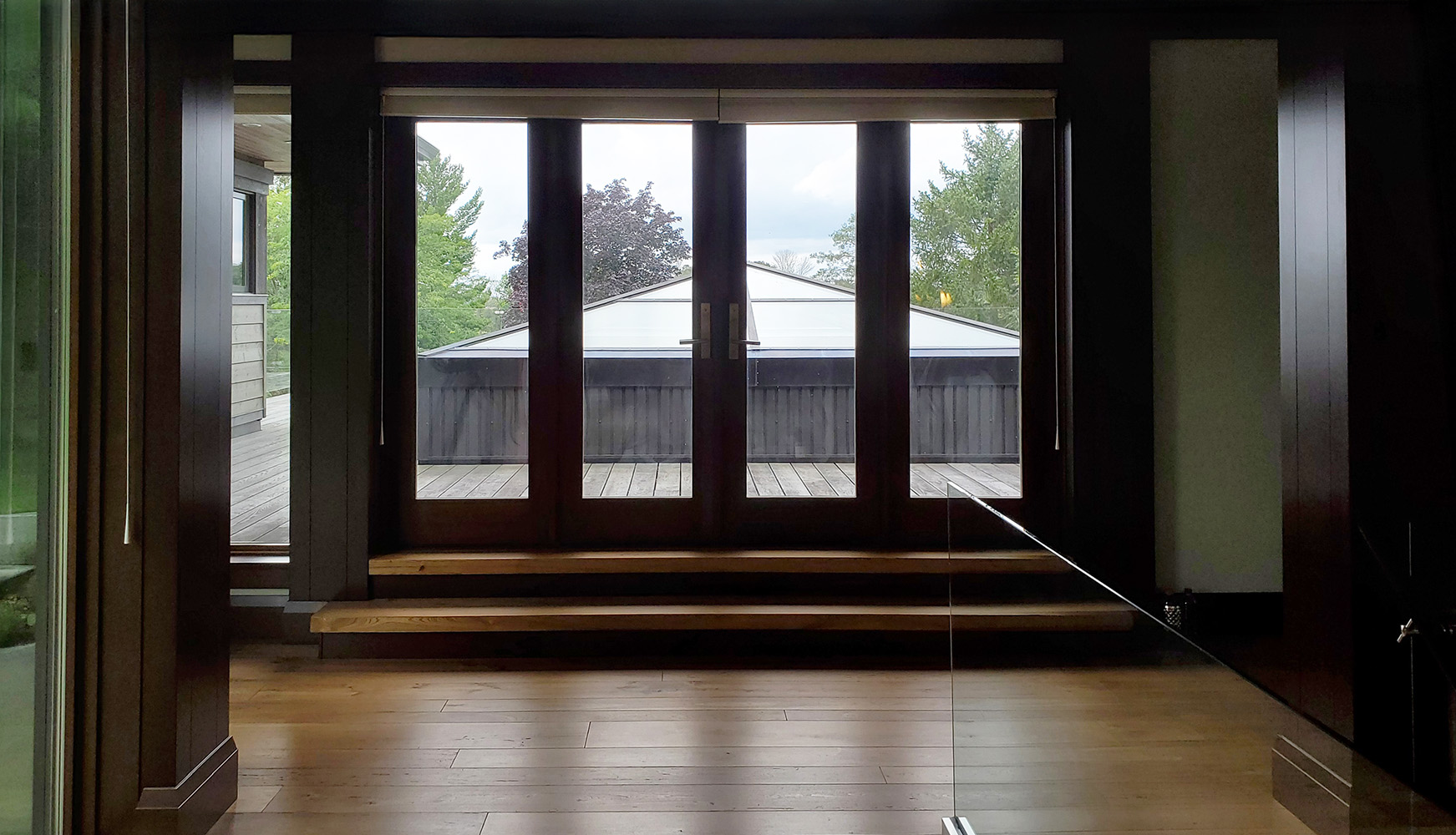 The Burlington House builds on the foundations of a pre-existing home from the 1960s to create a pathway across the site that guides you from the front through the winding heart of the home, and slowly reveals sweeping vistas of Burlington Bay. The monumental custom douglas fir door acts as a portal passing into a light-filled but secluded front lobby. A challenging series of changes in floor height from the pre-existing house were re-imagined into staircase that evokes memories of a meandering pathway over a sand dune, catching glimpses of the shimmering bay along the path. At the crest of the stairs, the lakefront opens up through a prismatic glass living space.