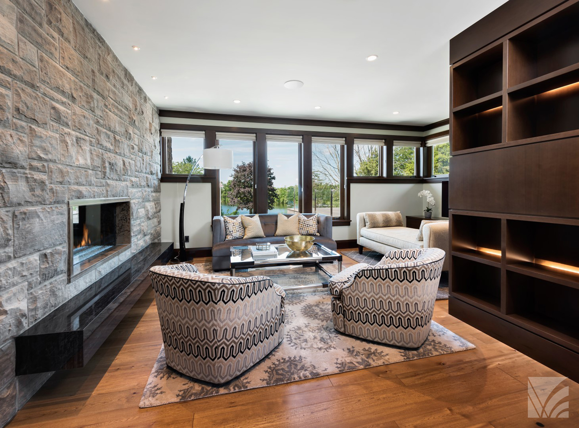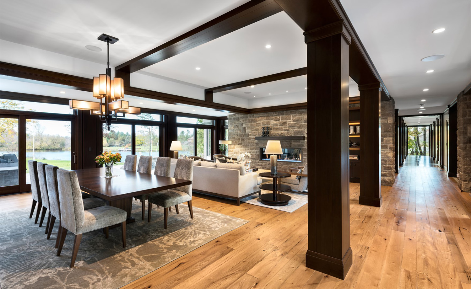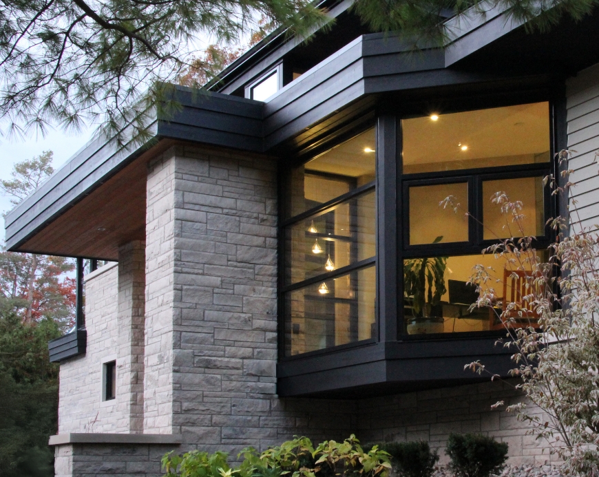 From the laneway, the Rideau River House is characterized by long sweeping horizontal lines. Bands of windows, sweeping roofs, and the generous porch that wrap around the house. Even the horizontal wood siding and the natural stone walls seem to reach out into the surrounding landscape, making the house feel at home on the flat and grassy bank of the Rideau River. The expansive roofs are supported by massive stone chimneys. Sheltered by stone fireplaces, the interior spreads into the surrounding landscape, looking out over the river. Large sliding glass doors provide uninterrupted views, with the indoor living space spilling out onto the stone terraces.