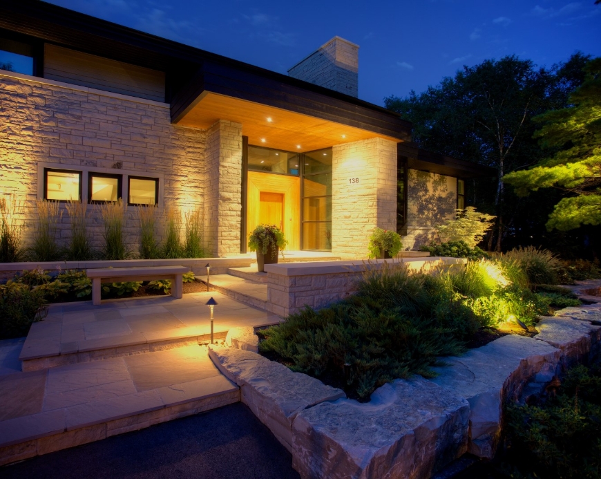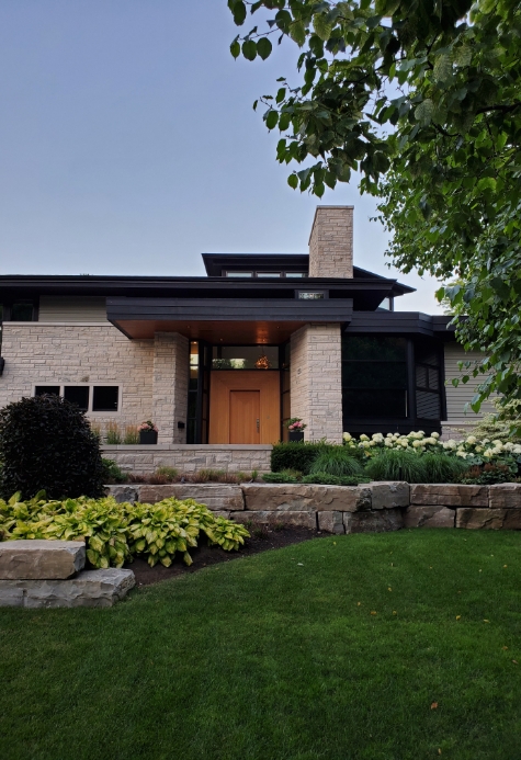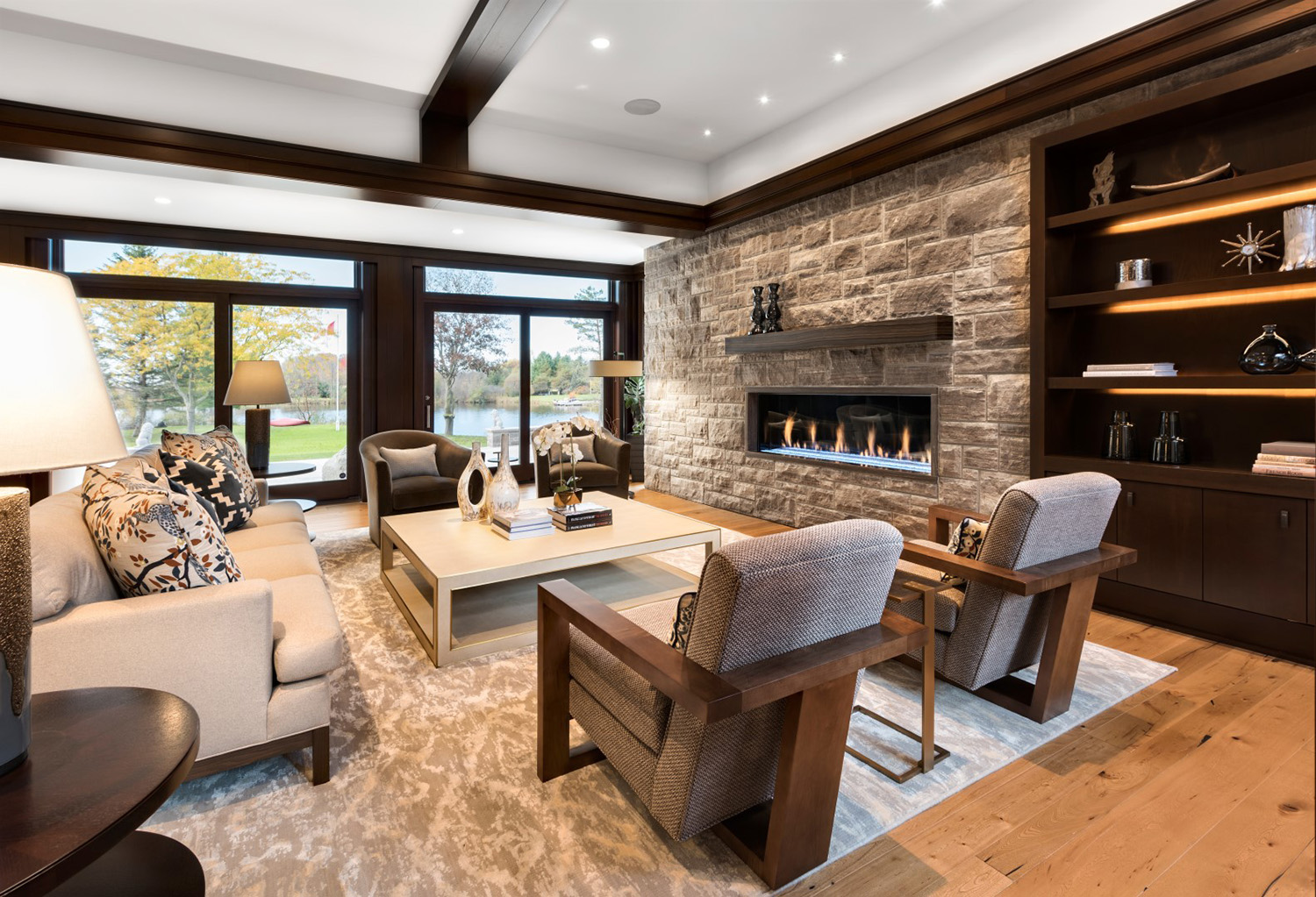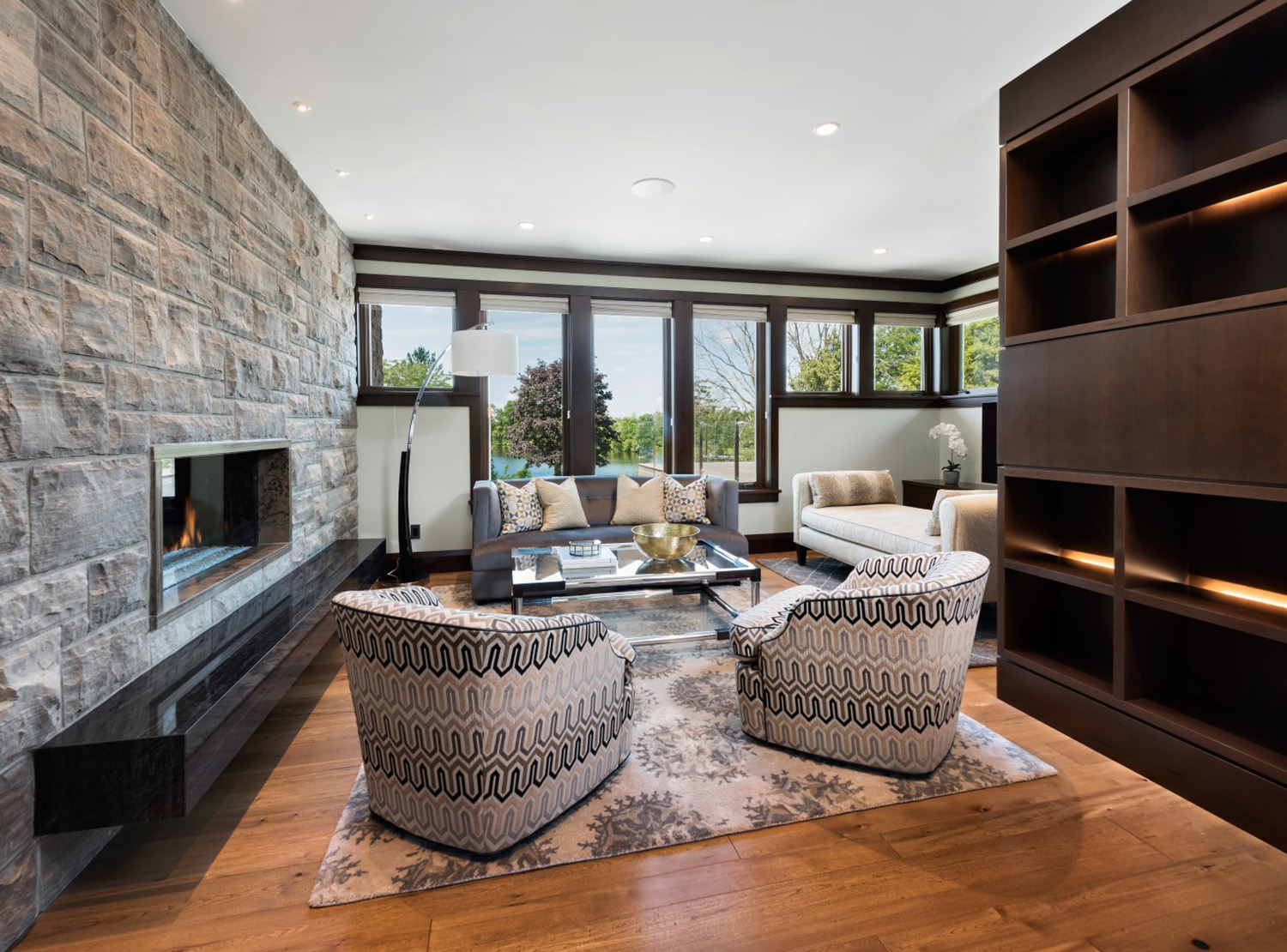From the laneway, the Rideau River House is characterized by long sweeping horizontal lines. Bands of windows, sweeping roofs, and the generous porch that wrap around the house. Even the horizontal wood siding and the natural stone walls seem to reach out into the surrounding landscape, making the house feel at home on the flat and grassy bank of the Rideau River. The expansive roofs are supported by massive stone chimneys. Sheltered by stone fireplaces, the interior spreads into the surrounding landscape, looking out over the river. Large sliding glass doors provide uninterrupted views, with the indoor living space spilling out onto the stone terraces.