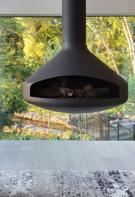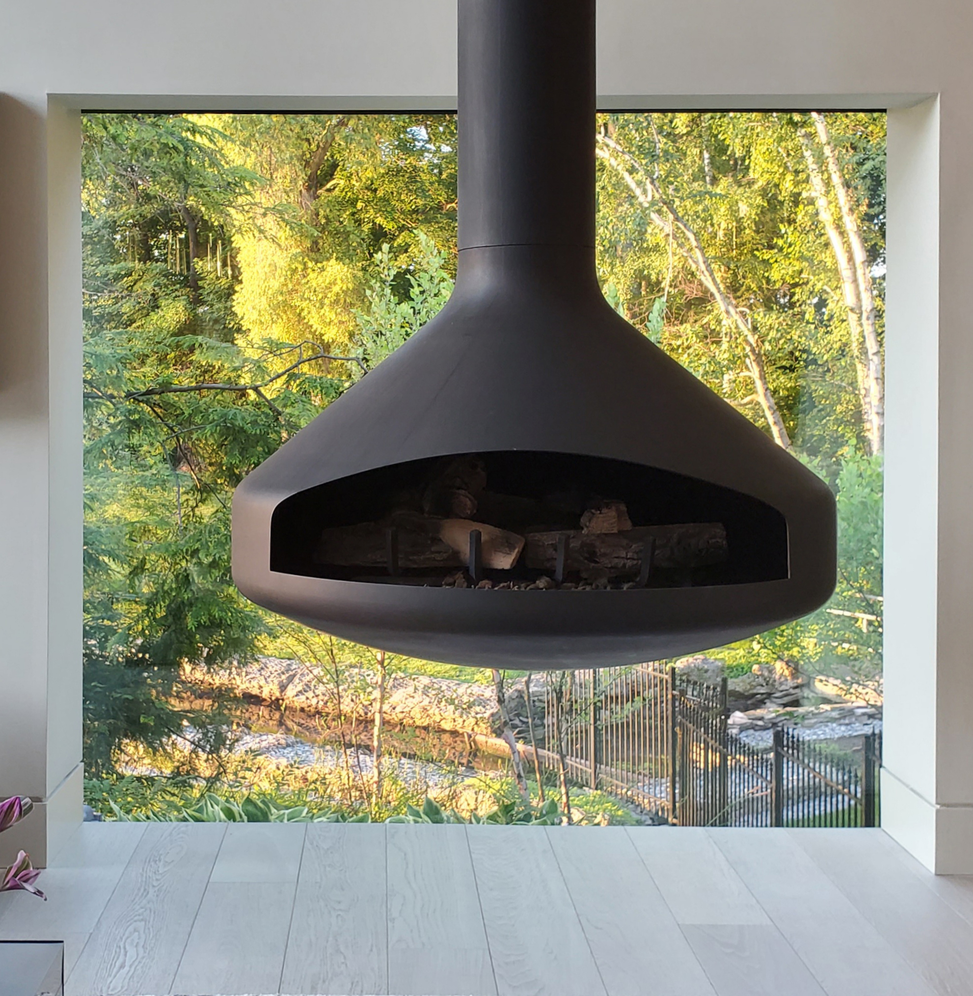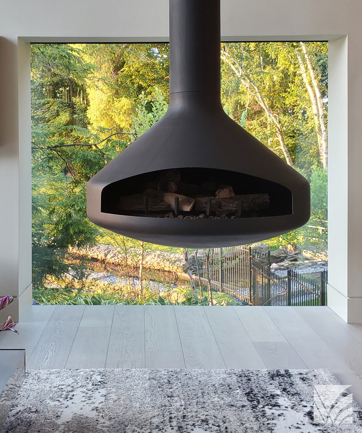 Light and glimpses of the forest open up all around through window openings framing the study, the family dining room, and a living room that gathers in around a fireplace which is suspended from the soaring ceiling. The glimpse past the fireplace to the surrounding white pines through the infinity window, creates a “campfire” effect The family bedrooms are sheltered up above the main living space, with the primary bedroom being at the pinnacle of the house as a kind of lighthouse platform, overlooking the harbour. The living space spills out beyond the floor-to-ceiling windows, onto the pool patio.