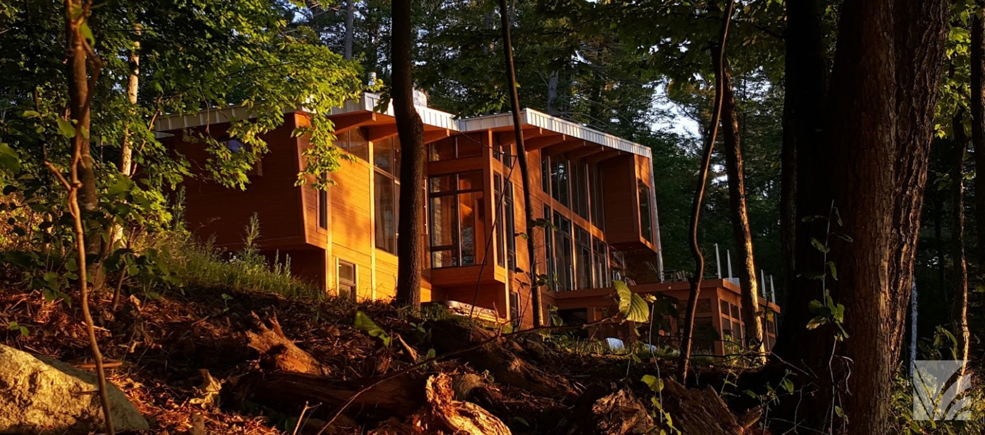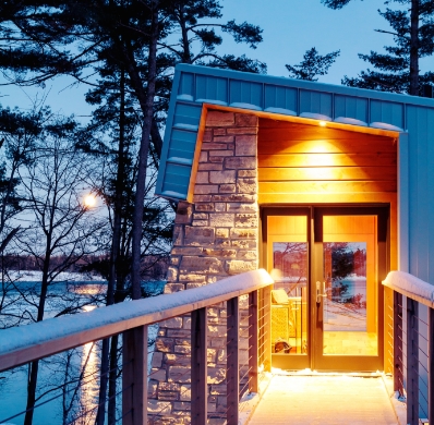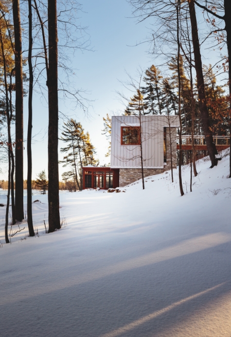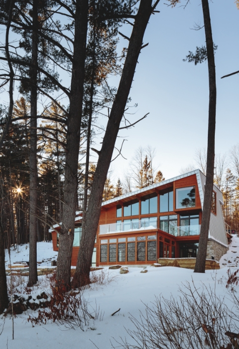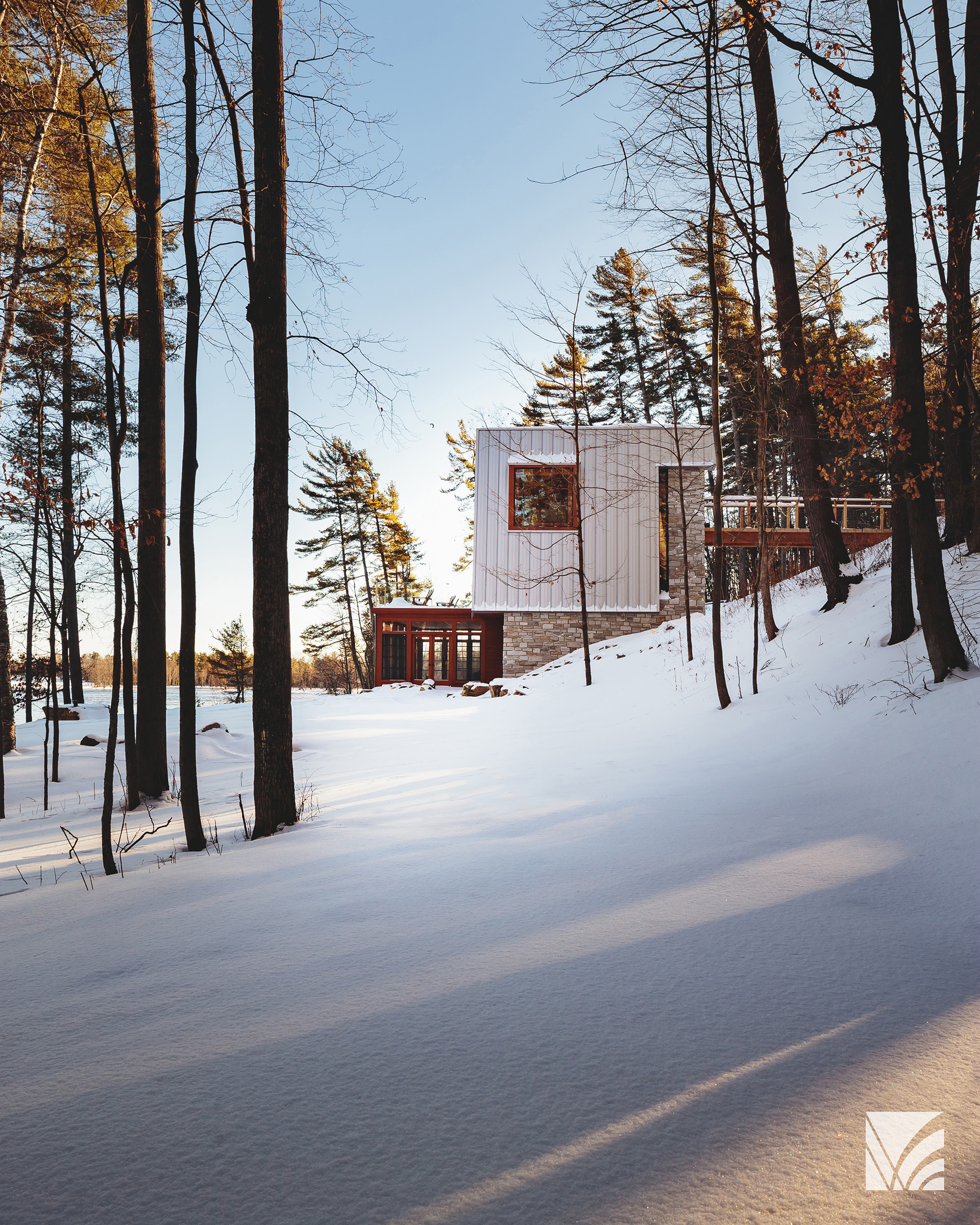 Discovering Arrowwood Cottage is to chance upon both a family retreat and a woodland cathedral. Reaching skyward, it competes for light with its neighbours: pines, maples, beeches, and birch. Camouflaged and inconspicuous in the summer - except for its light-catching clerestory - this peaceful sanctuary is unveiled each fall, glowing warmly through the dark and snowy winter nights.