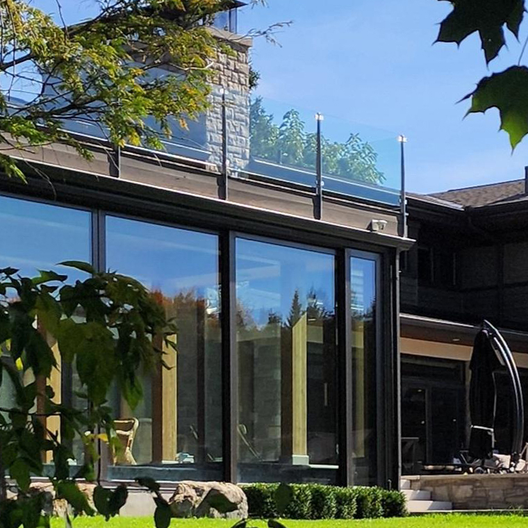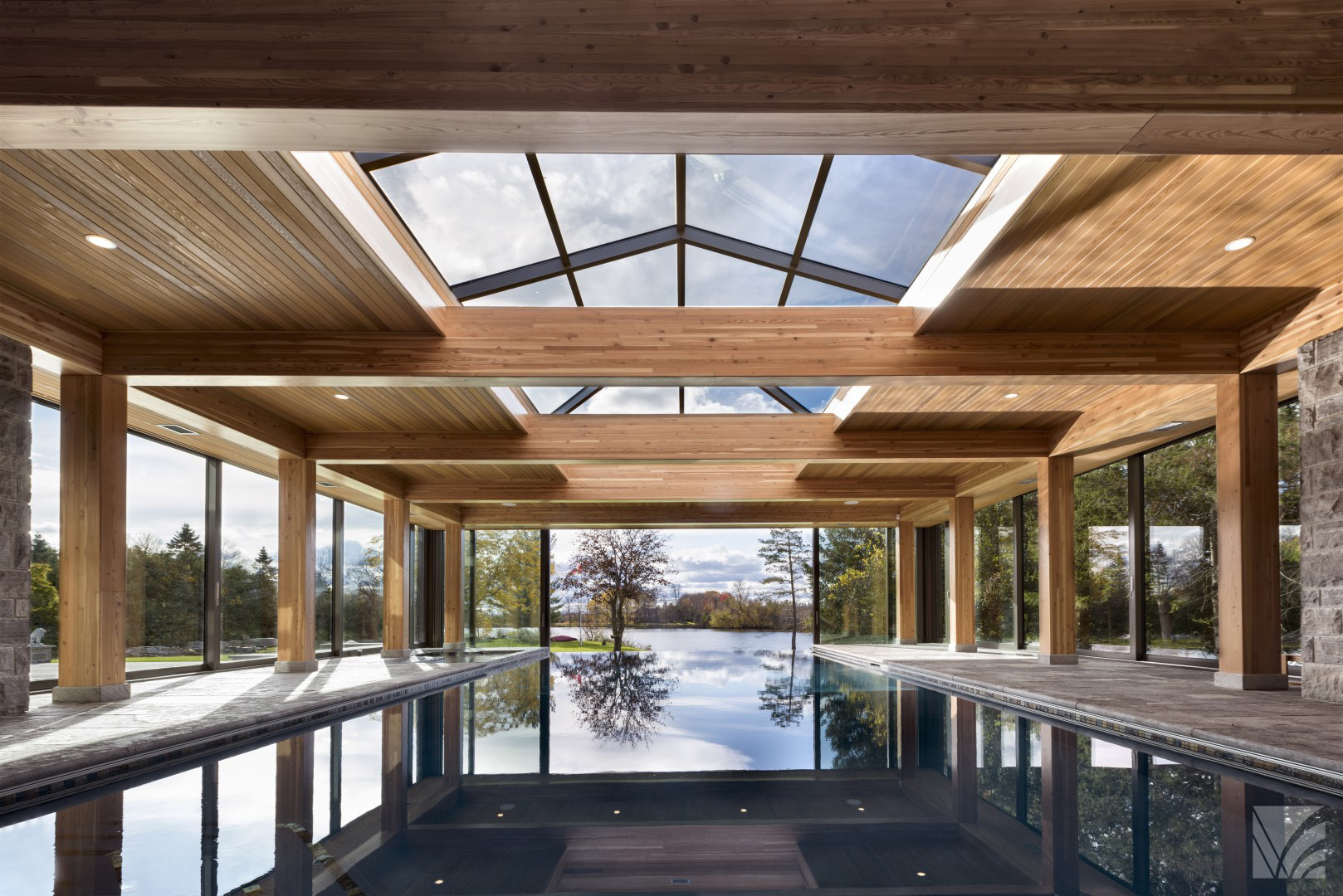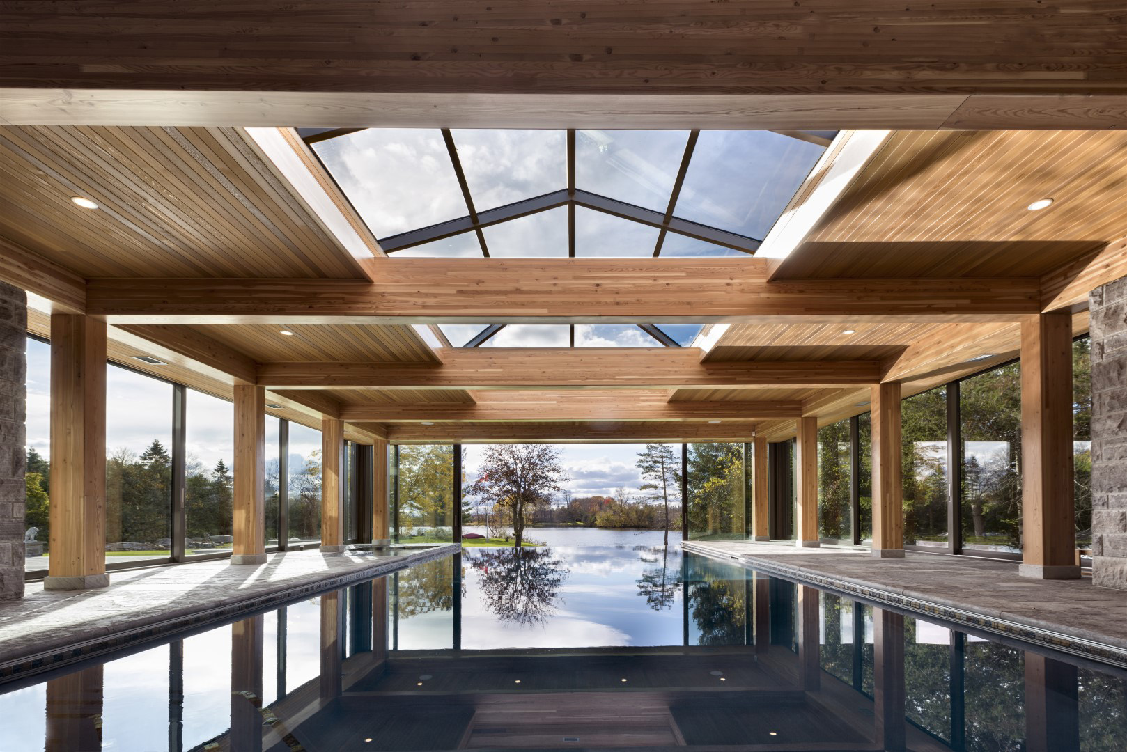 The Rideau River House utilizes state-of-the-art mechanical systems to eliminate any scent of chorine in the house and to control humidity fluctuations throughout the house that can often be caused by indoor pools. An engineered mass-timber structure was used to achieve the long spans of the indoor pool room. The use of mass-timber ensured a column-free space that is open and feels connected to the wooded landscape, while also providing a natural feeling of warmth to the swim area, even on the coldest of winter days when the Rideau River outside is frozen over. The design of the house includes a small residential elevator to ensure that the clients will be able to use and enjoy their home on the river for many years to come.
