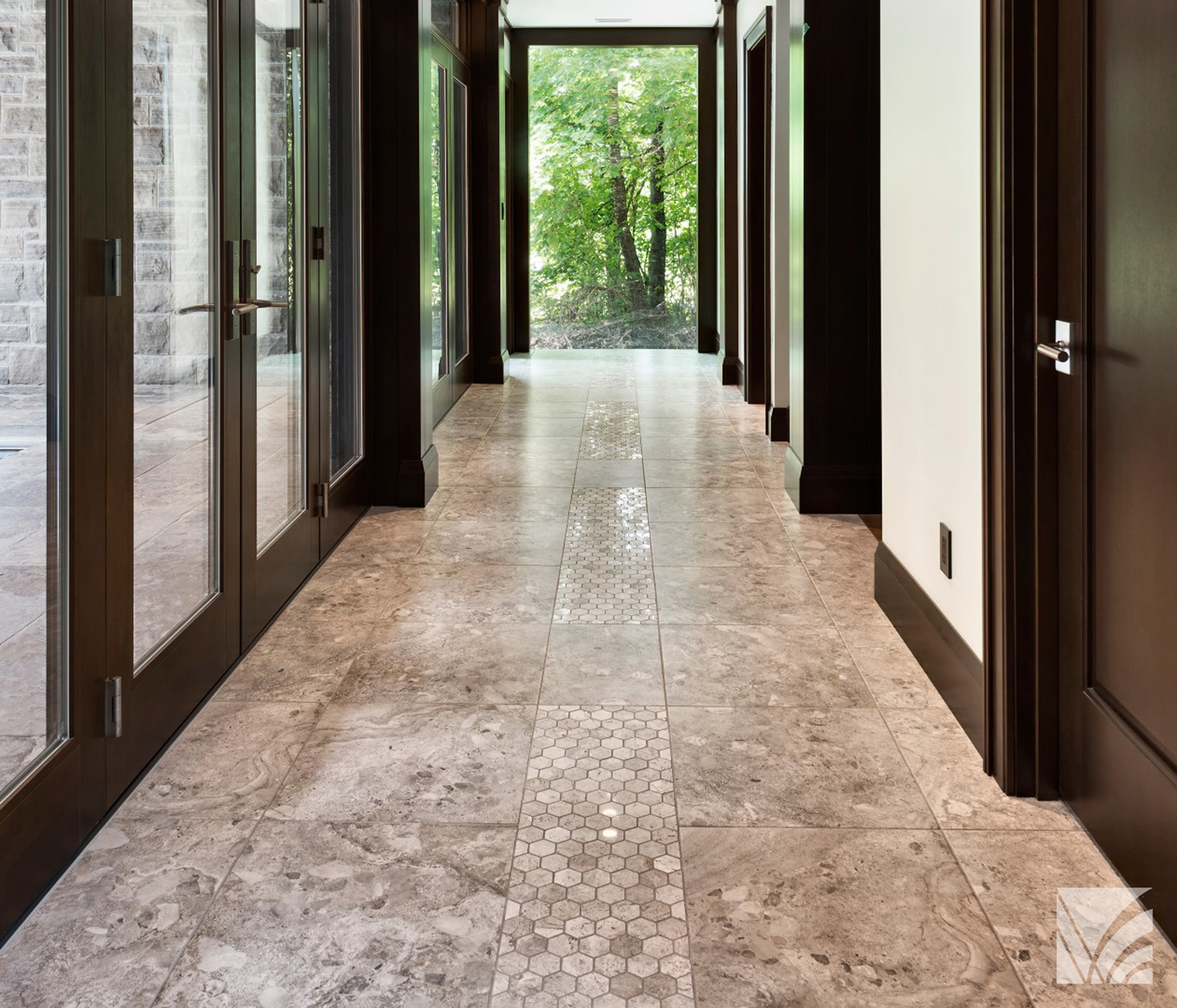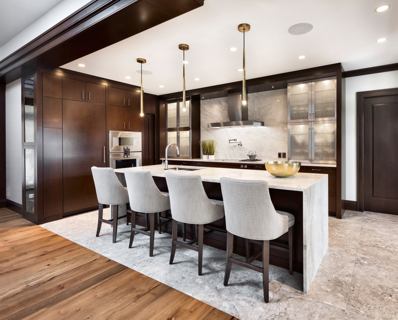 The living spaces of the house are woven together along a hallway axis, tucked behind the stone chimneys. While the hallway feels secluded from the expanse of the rivers edge, an infinity window at the north end of the hall provides an intimate look to the surrounding woodlands, ensuring that even in moments of seclusion, every portion of the house feels deeply tied to the surrounding landscape. This connection reaches its most dramatic at the indoor pool. While the pool is fully enclosed and heated year-round, expansive glazing and the generous conservatory roof make it feel as though one is swimming outside. The river’s end of the pool has an infinity edge so that when the patio doors are open, the horizon of the pool blurs into the shimmering water of the river beyond, giving the sense that one is swimming in the river. The house has become as integral a part of the landscape, as the landscape is to ever part of the house.