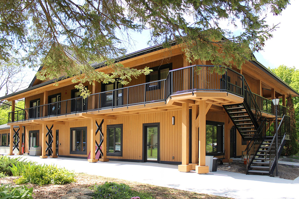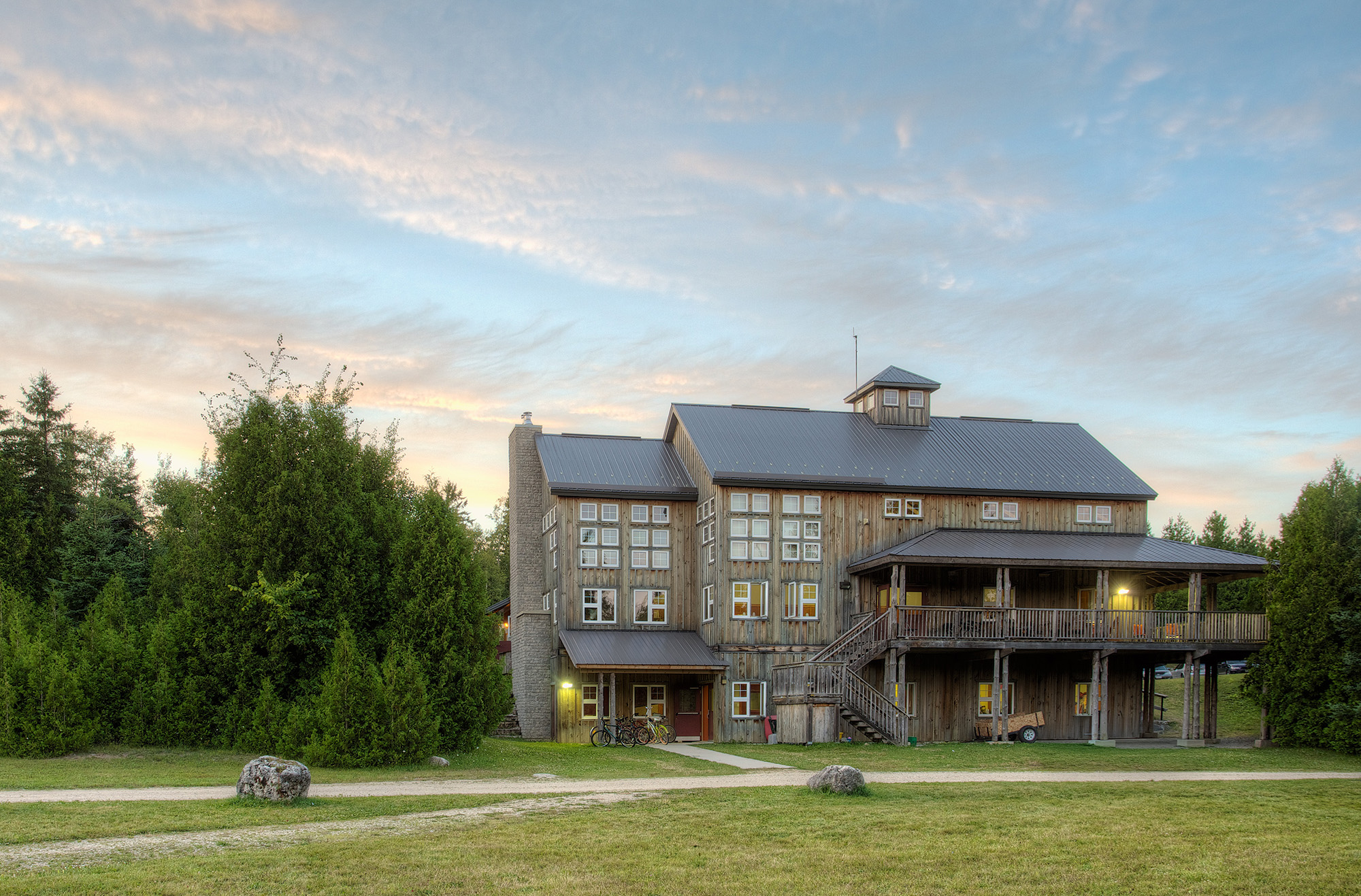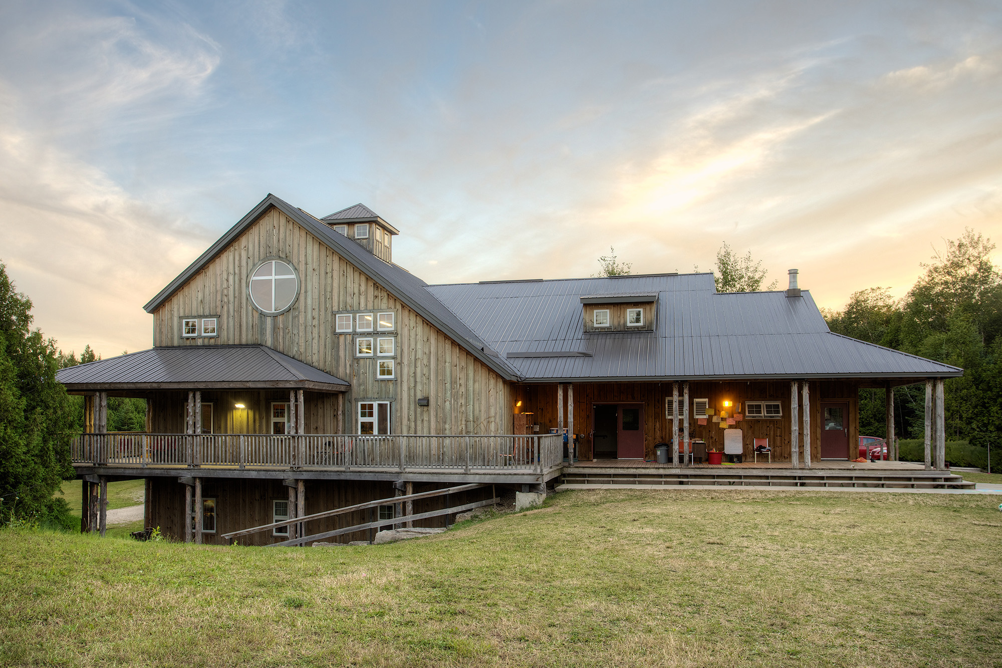 The heart of the summer camp is the Main Lodge. Campers arriving at Campfire! are greeted by the sweeping lodge veranda. Life at camp revolves around the lodge veranda. It is where campers muster every morning to hear the plans for the day. In their free time, campers and councillors sit on the steps or the many muskoka chairs, and the porch roof is a welcome reprieve for people running from their cabins through the rain to breakfast. The Lodge was built into a hillside affording a practical use of space that is accessible at grade on two levels. The low welcoming verandah on the entry side of the lodge wraps around the building, out over the hillside to become a breezy deck overlooking the sports field. Inside, the lodge houses the great hall for dining and gathering, a fireside room, a fully equipped commercial kitchen, games room, accessible washrooms with showers, Camp nurse office, and staff offices and staff sleeping accommodation.