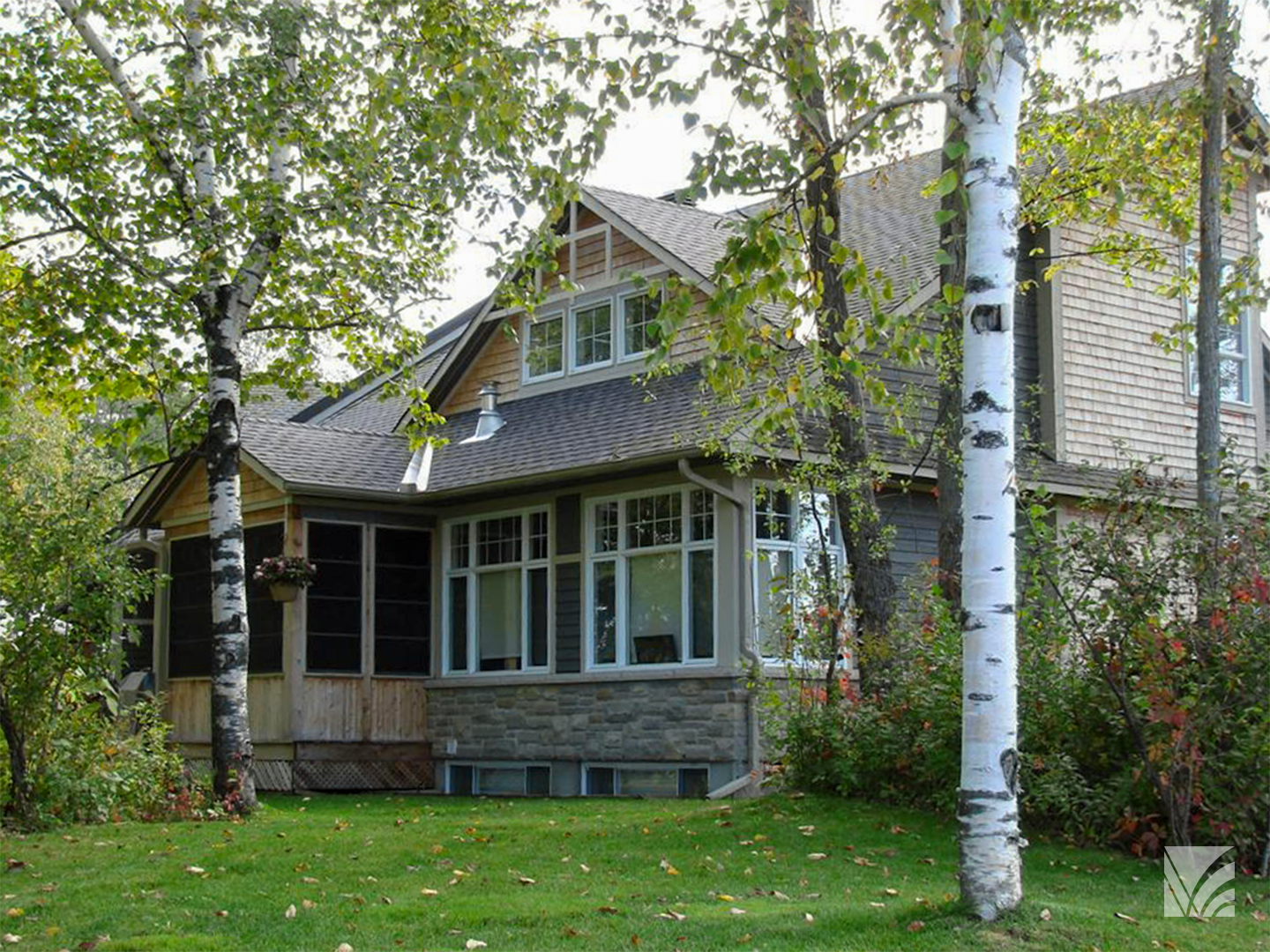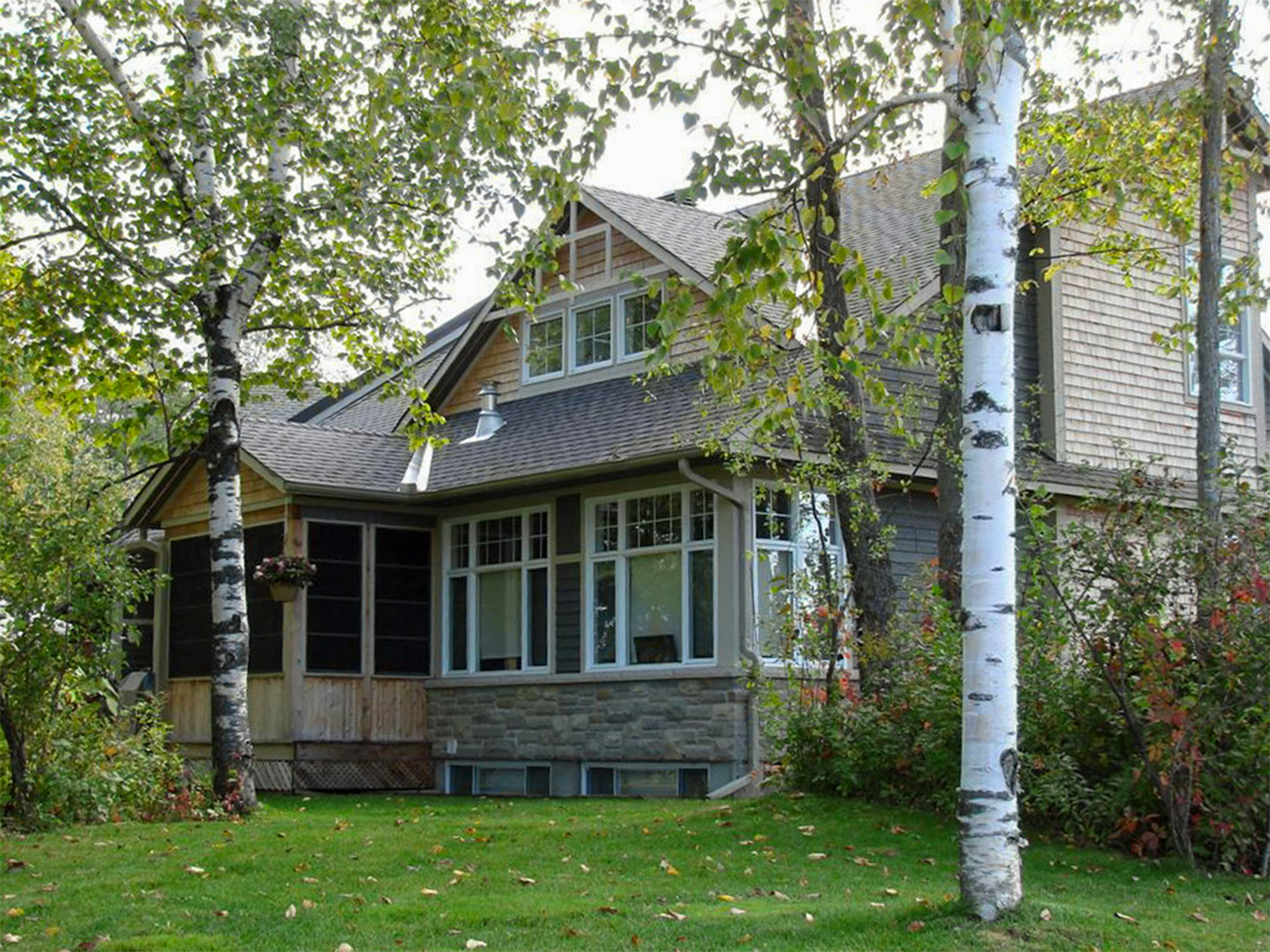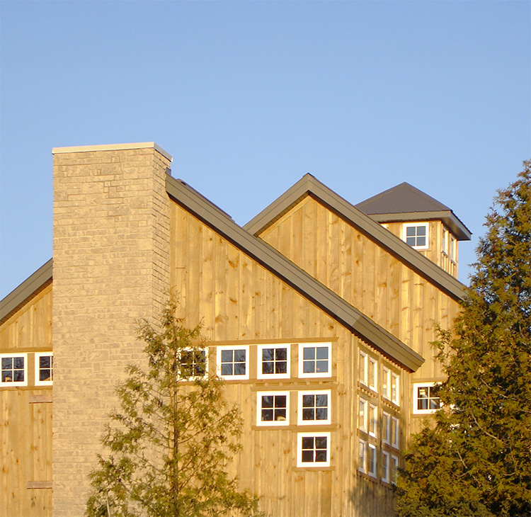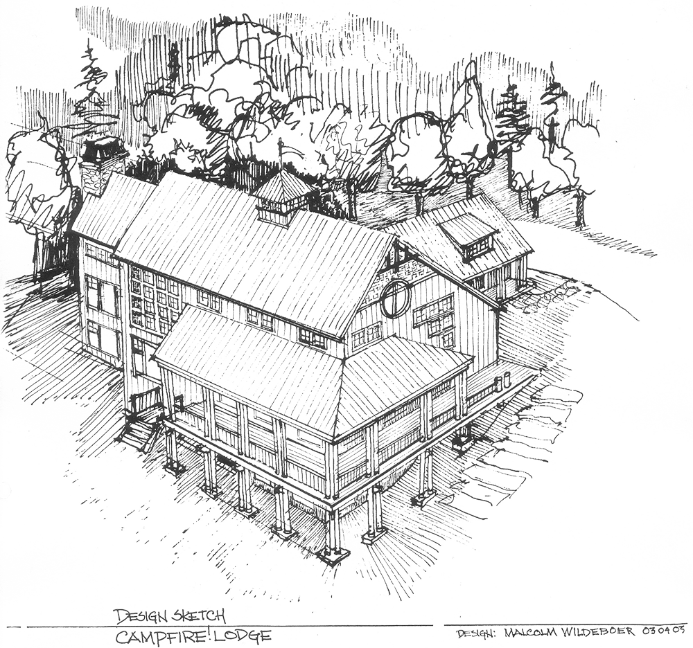 The heart of the summer camp is the Main Lodge. Campers arriving at Campfire! are greeted by the sweeping lodge veranda. Life at camp revolves around the lodge veranda. It is where campers muster every morning to hear the plans for the day. In their free time, campers and councillors sit on the steps or the many muskoka chairs, and the porch roof is a welcome reprieve for people running from their cabins through the rain to breakfast. The Lodge was built into a hillside affording a practical use of space that is accessible at grade on two levels. The low welcoming verandah on the entry side of the lodge wraps around the building, out over the hillside to become a breezy deck overlooking the sports field. Inside, the lodge houses the great hall for dining and gathering, a fireside room, a fully equipped commercial kitchen, games room, accessible washrooms with showers, Camp nurse office, and staff offices and staff sleeping accommodation.