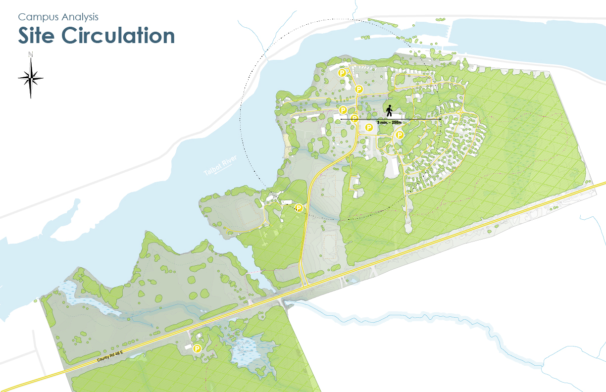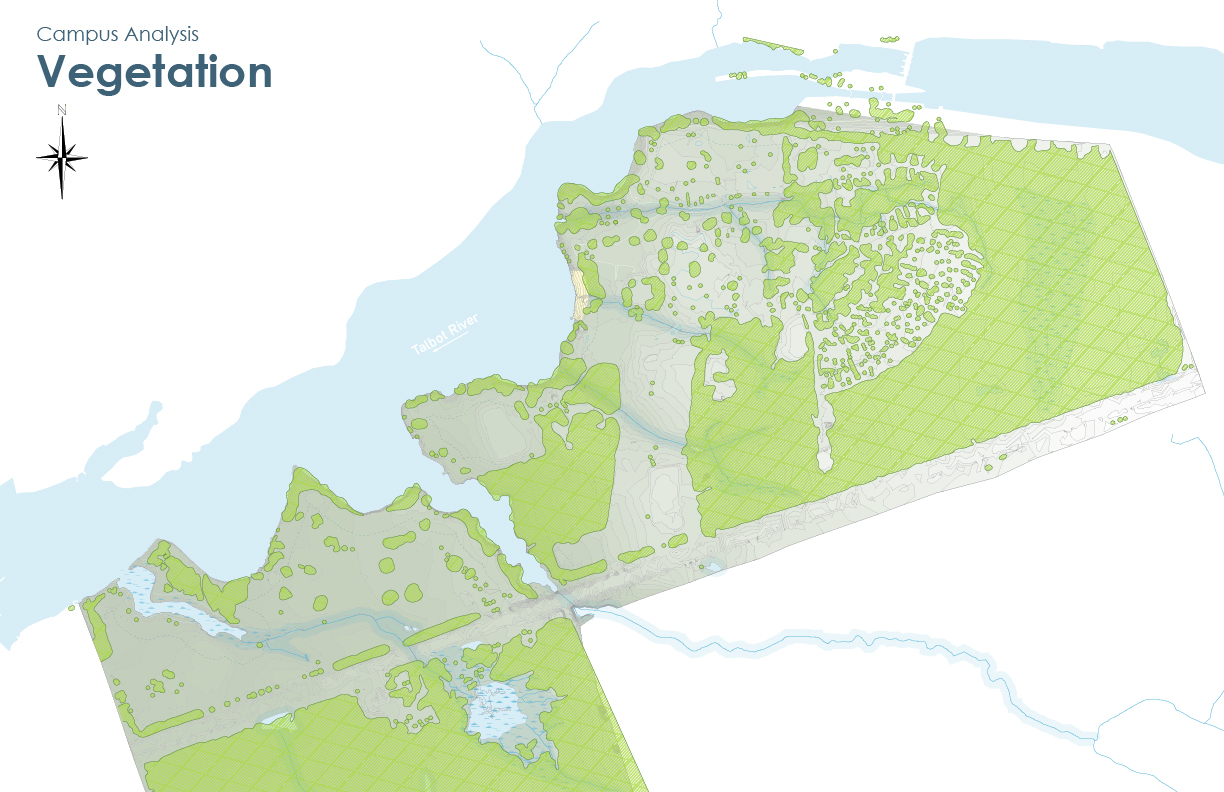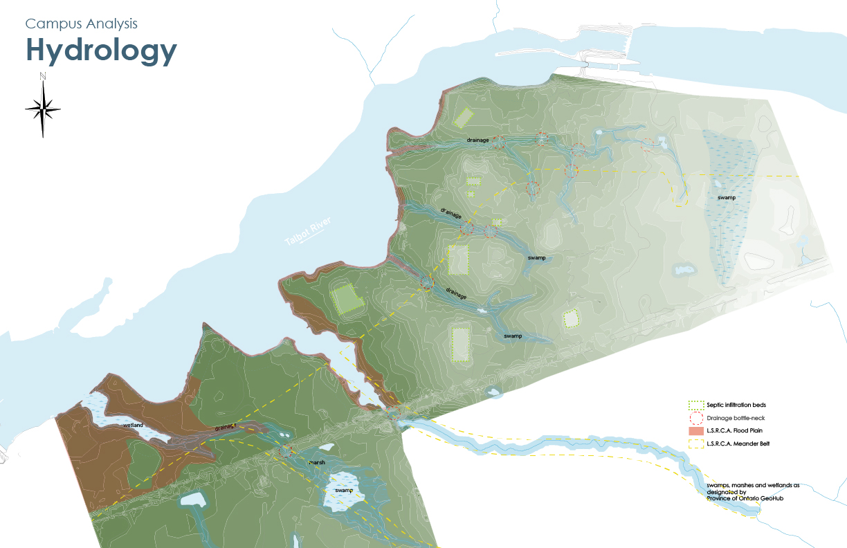 A key goal of the masterplan is to reconnect the camp to its natural environment by addressing ecological issues. Mapping the site’s hydrology revealed drainage bottlenecks causing seasonal flooding. Removing these barriers and rewilding natural drainage channels will not only improve the camp’s serviceability but also enhance the local ecology and water quality of the Talbot River.